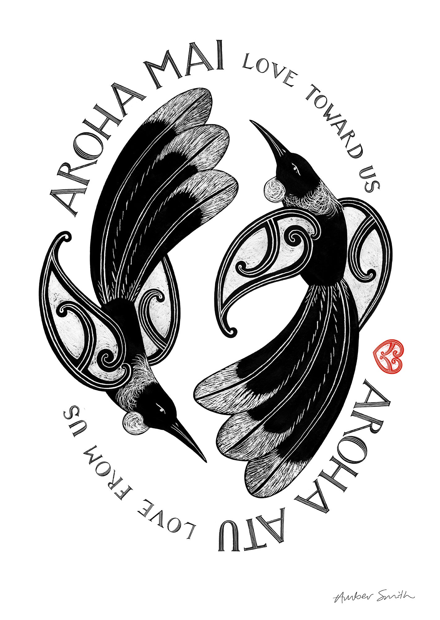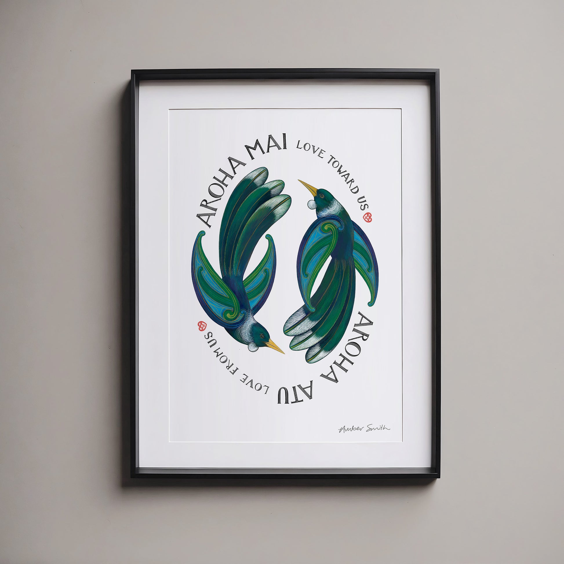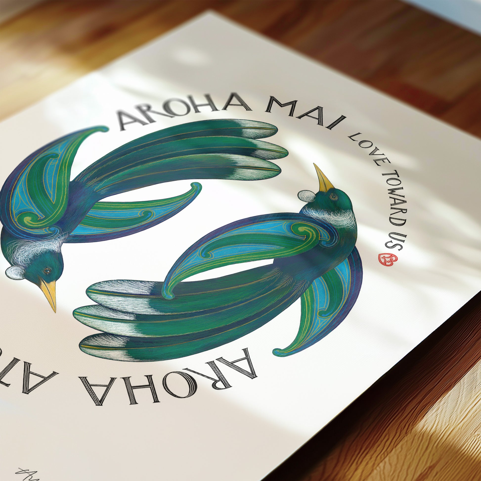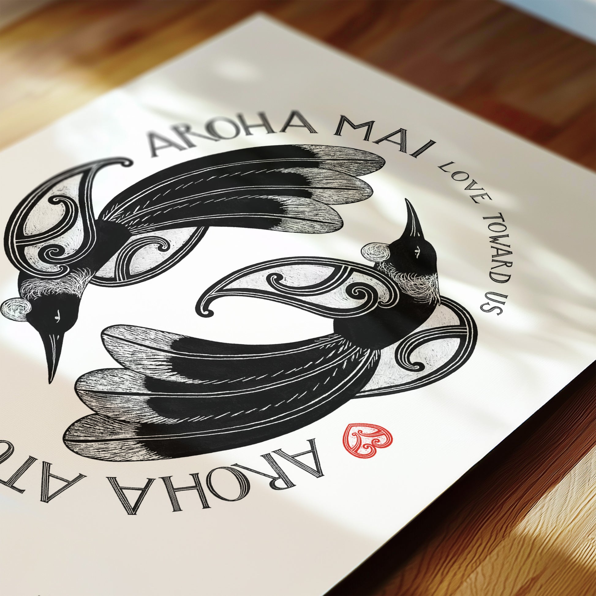 A sweet reminder of love shared and returned - the love that you give to me I give back to you. Aroha is more than love - it holds kindness, compassion, care, and connection. In this artwork, tui fly in a forever cycle, symbolising the reciprocity of love.