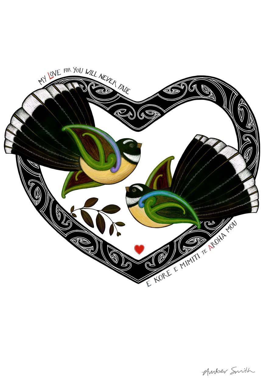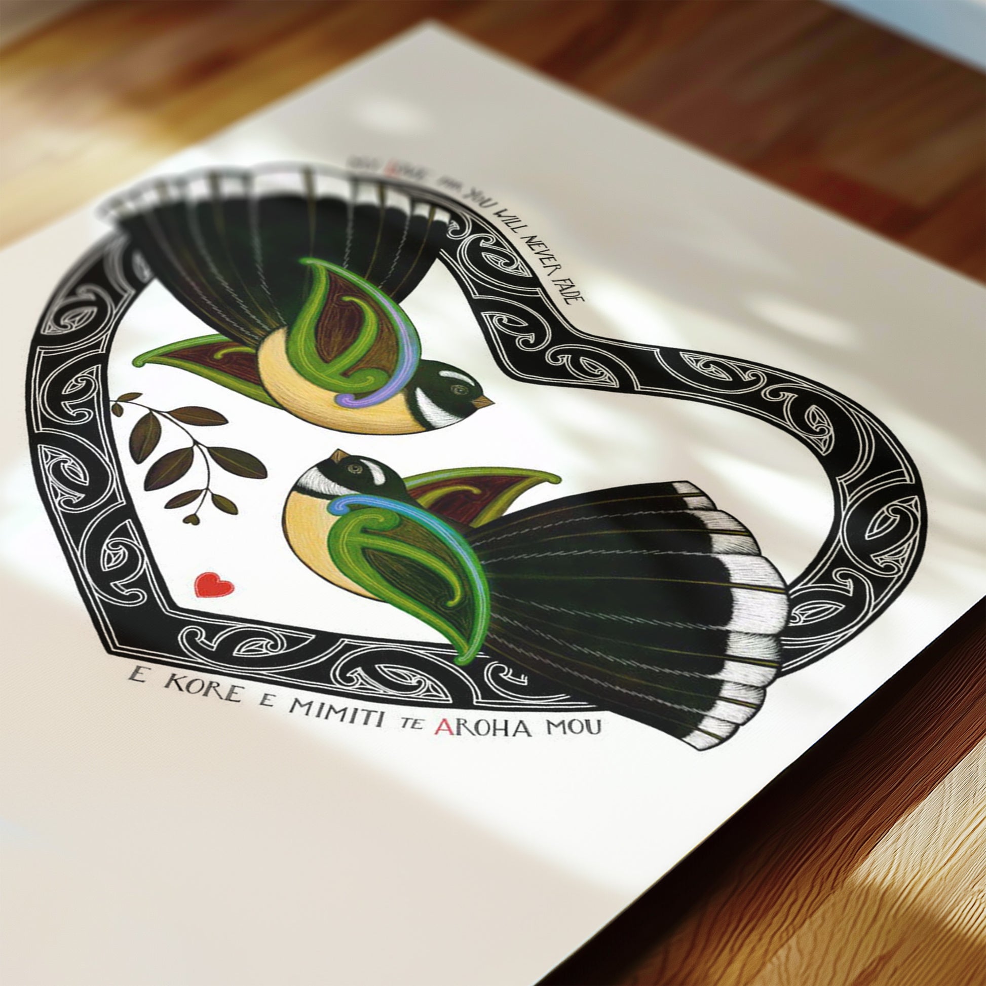 The playful pīwakawaka remind us that love is always close, flitting at our side and carrying messages of devotion: E kore e mimiti te aroha mōu — My love for you will never fade. More than affection, it’s a promise of love that endures through time and change.