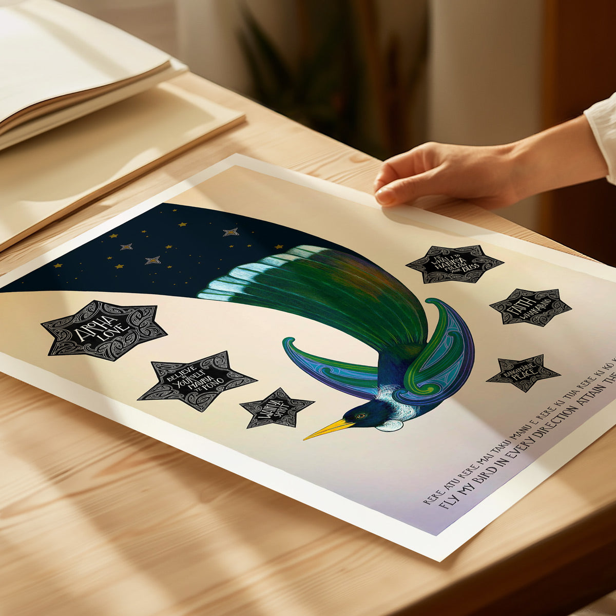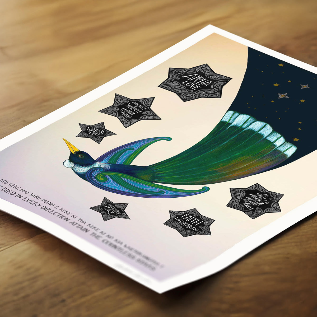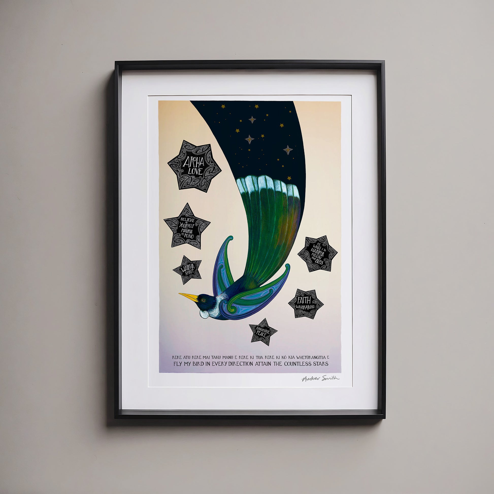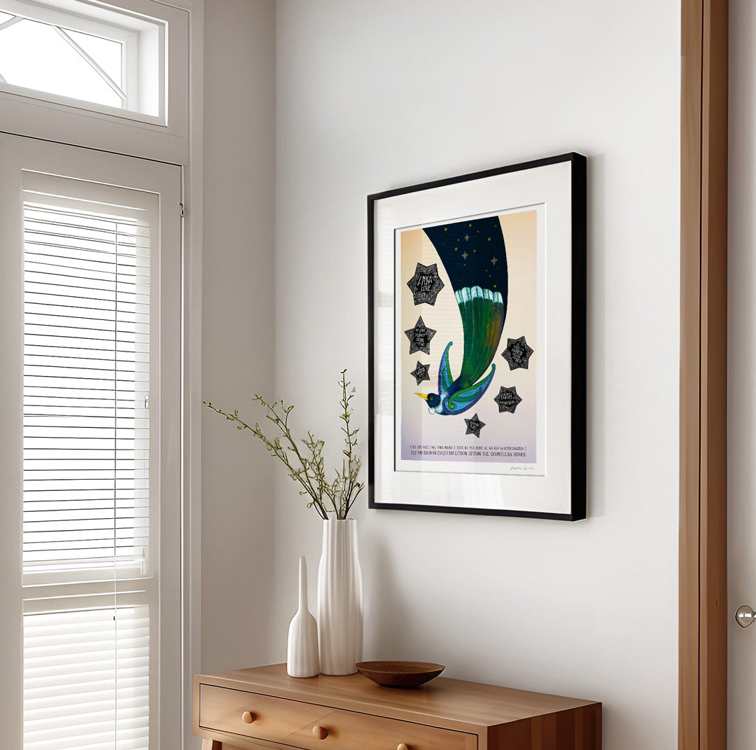 This hand-painted print shows a tui in flight at dawn, its tail feathers holding the night sky as it soars into the new day. Six guiding stars shine around it, each carrying words of encouragement and wisdom. It’s a print of hope and possibility — a reminder that wherever you fly, guidance and love are always with you.