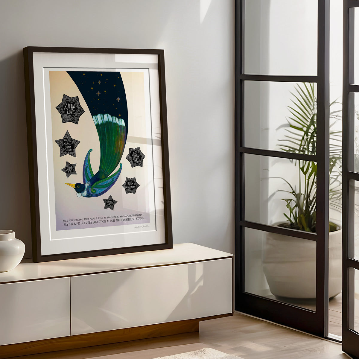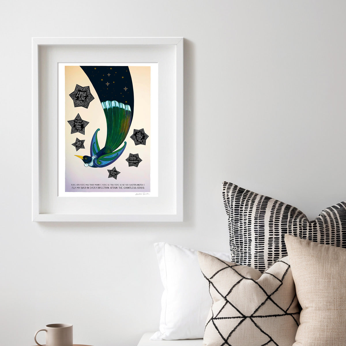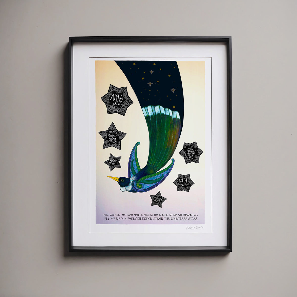 This hand-painted print shows a tui in flight at dawn, its tail feathers holding the night sky as it soars into the new day. Six guiding stars shine around it, each carrying words of encouragement and wisdom. It’s a print of hope and possibility — a reminder that wherever you fly, guidance and love are always with you.