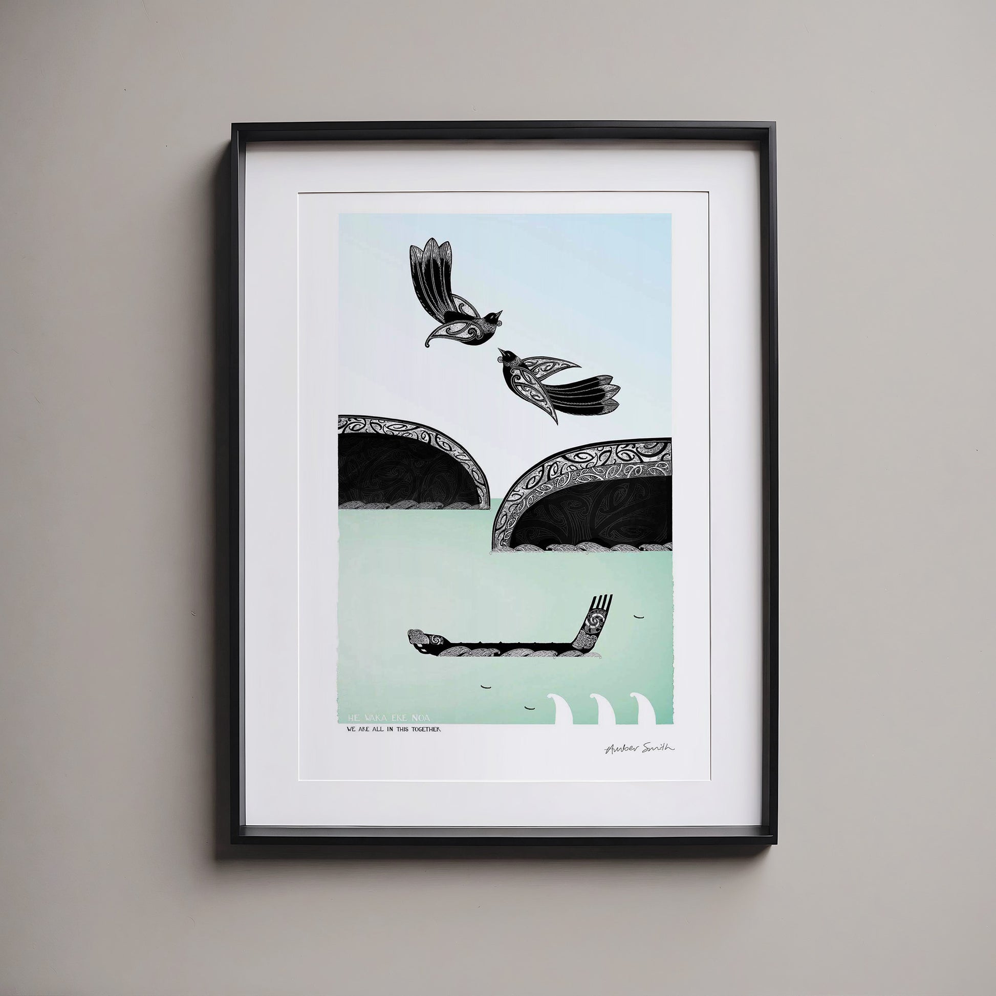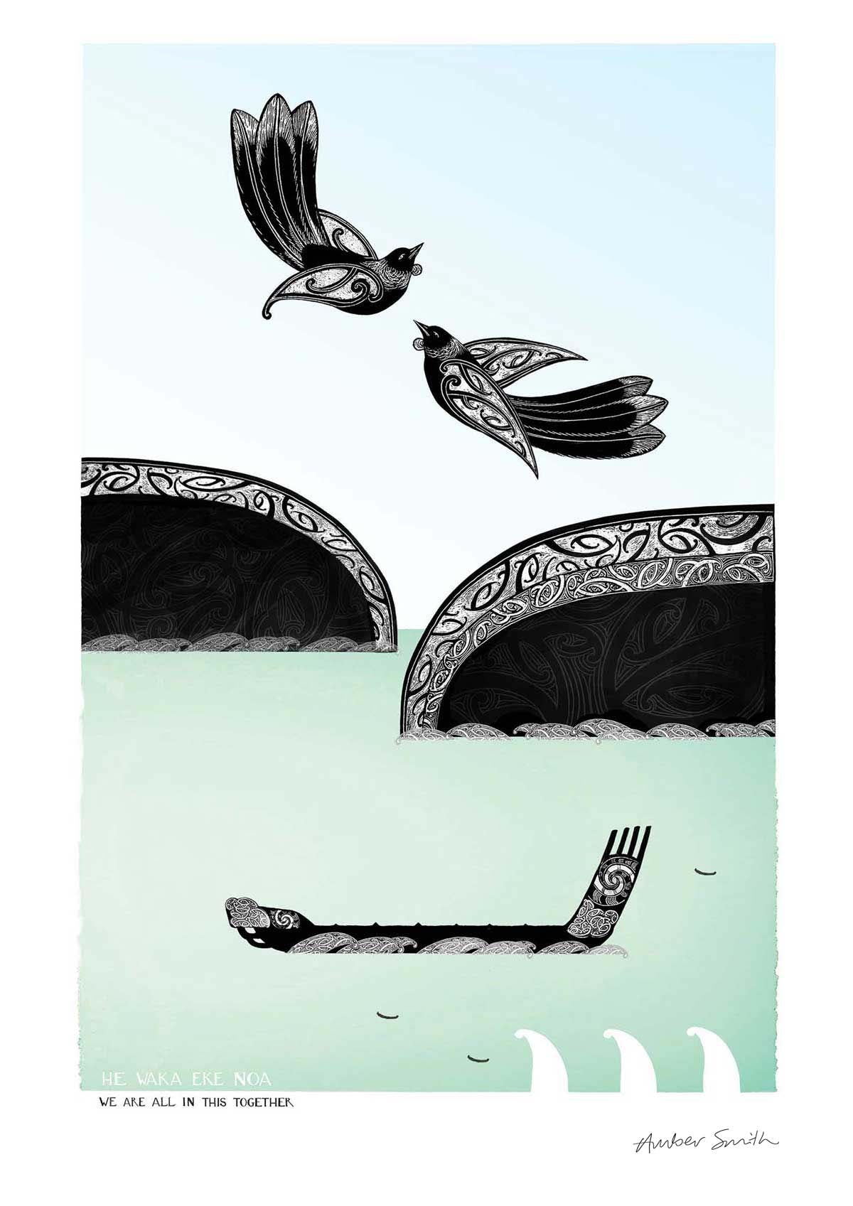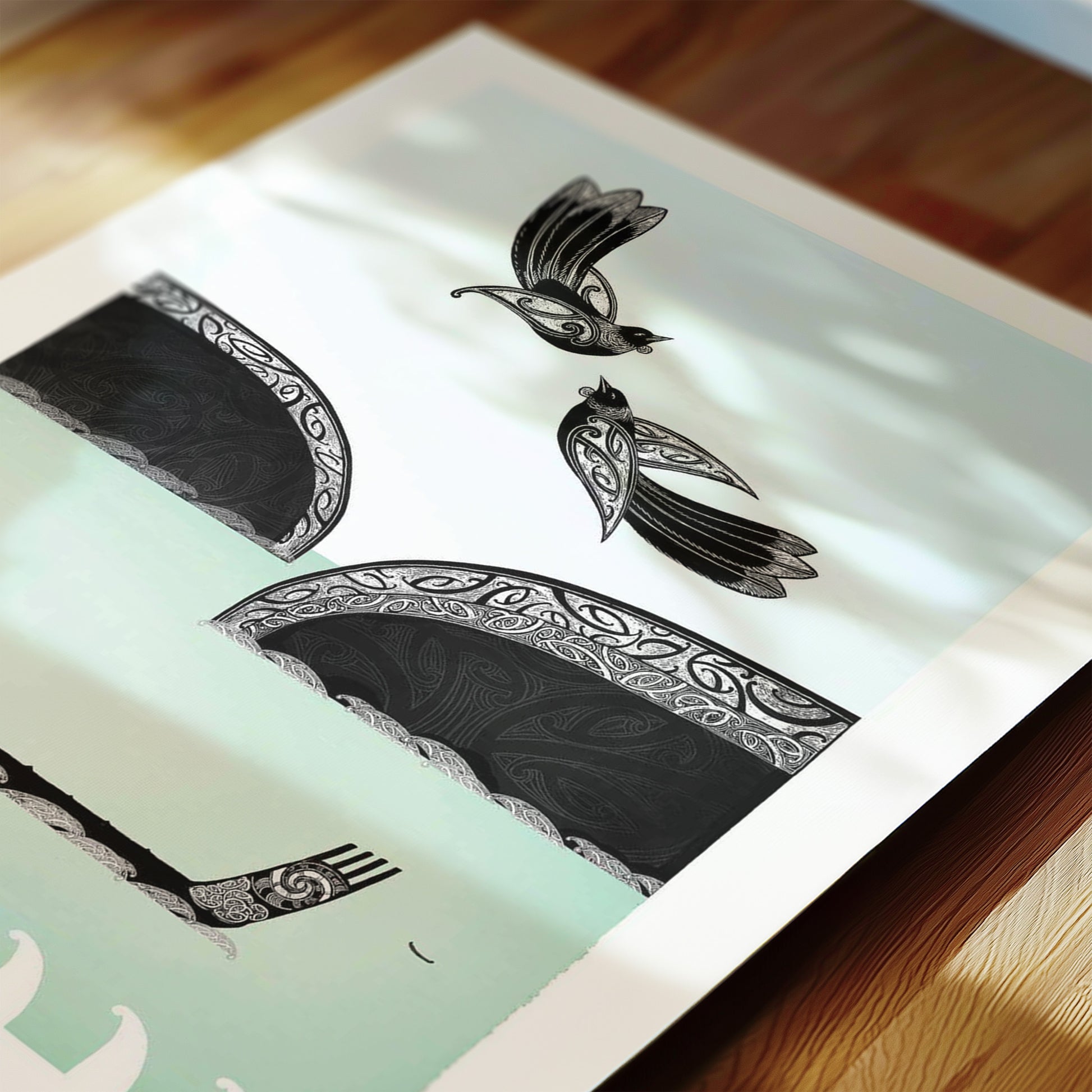 The waka travels through the sea of life, watched over and blessed by the ancestor spirits above (in the form of Tūi) - This print is about belonging and togetherness and whanau. Its about being there for each other and being united in purpose. The waves, hills, and tui wings, decorated with kowhaiwhai patterns, show how everything is connected - each part supporting the others, each person part of the bigger picture - That we all have a place, and that we all matter.