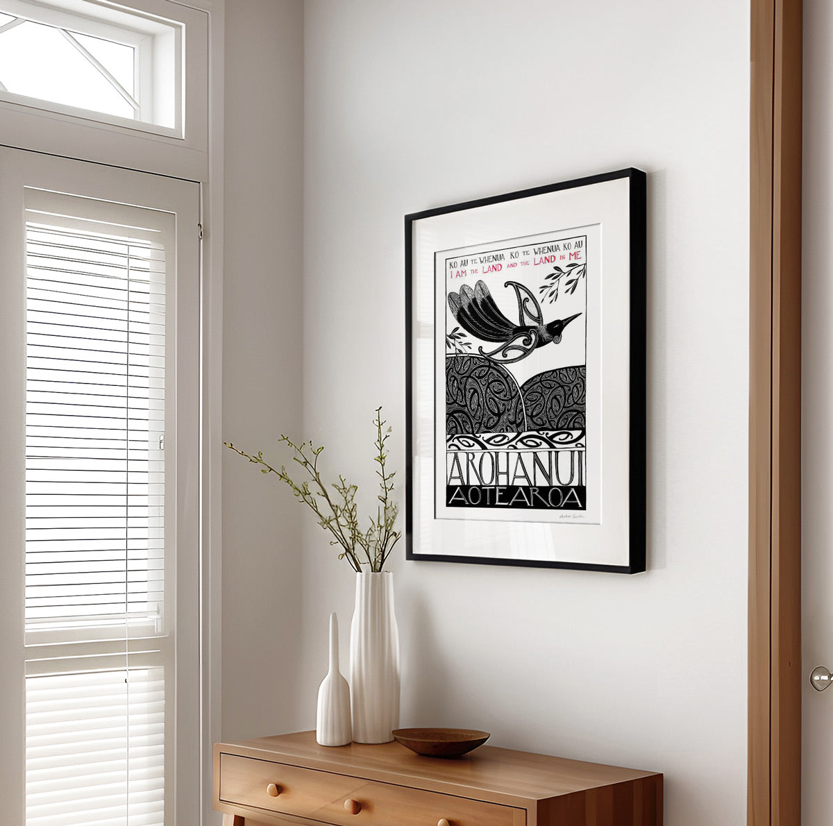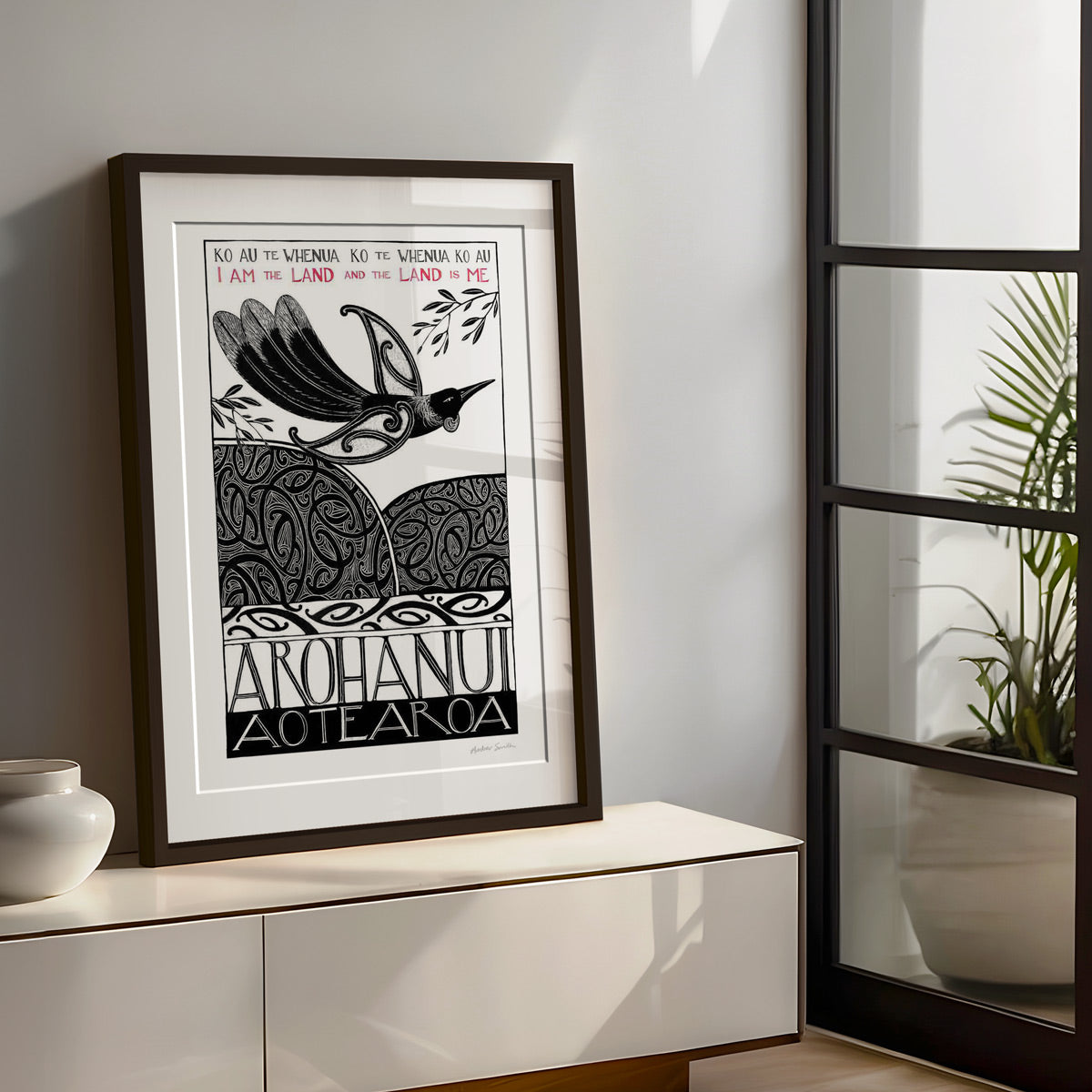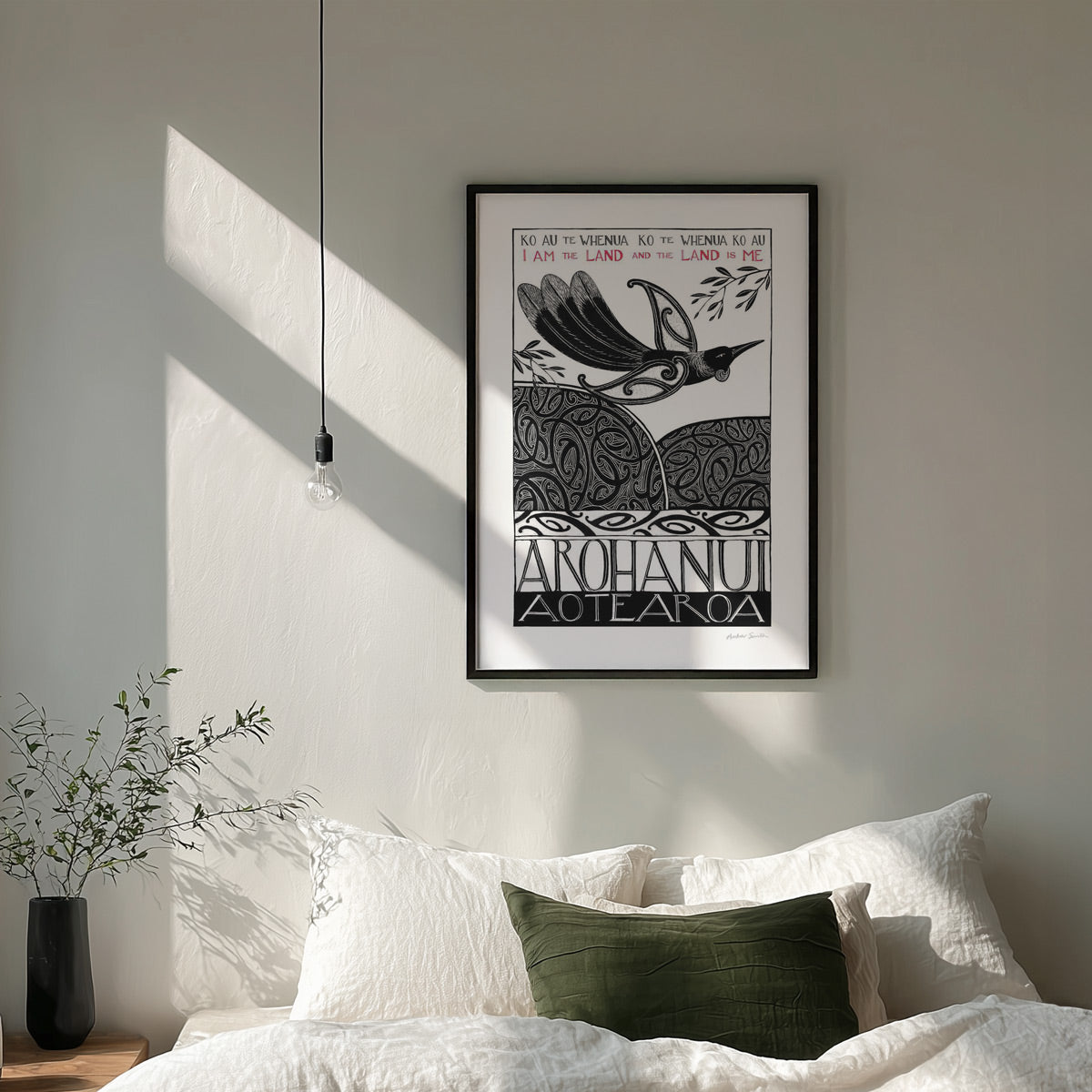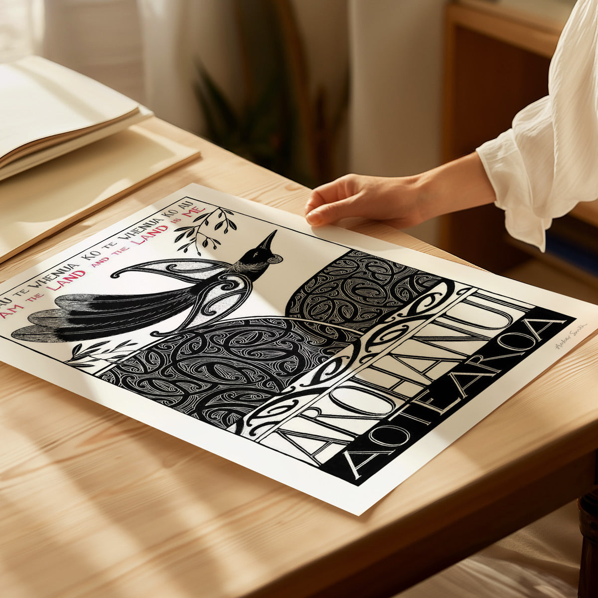 This print is about our connection to Aotearoa – our tūrangawaewae, the place where we stand and belong. Wherever we are in the world, Aotearoa lives within us, grounding us and giving us a sense of home. The tui soars above land and sea, carrying the guardianship of the land and the spirit of the native bush - Arohanui Aotearoa.