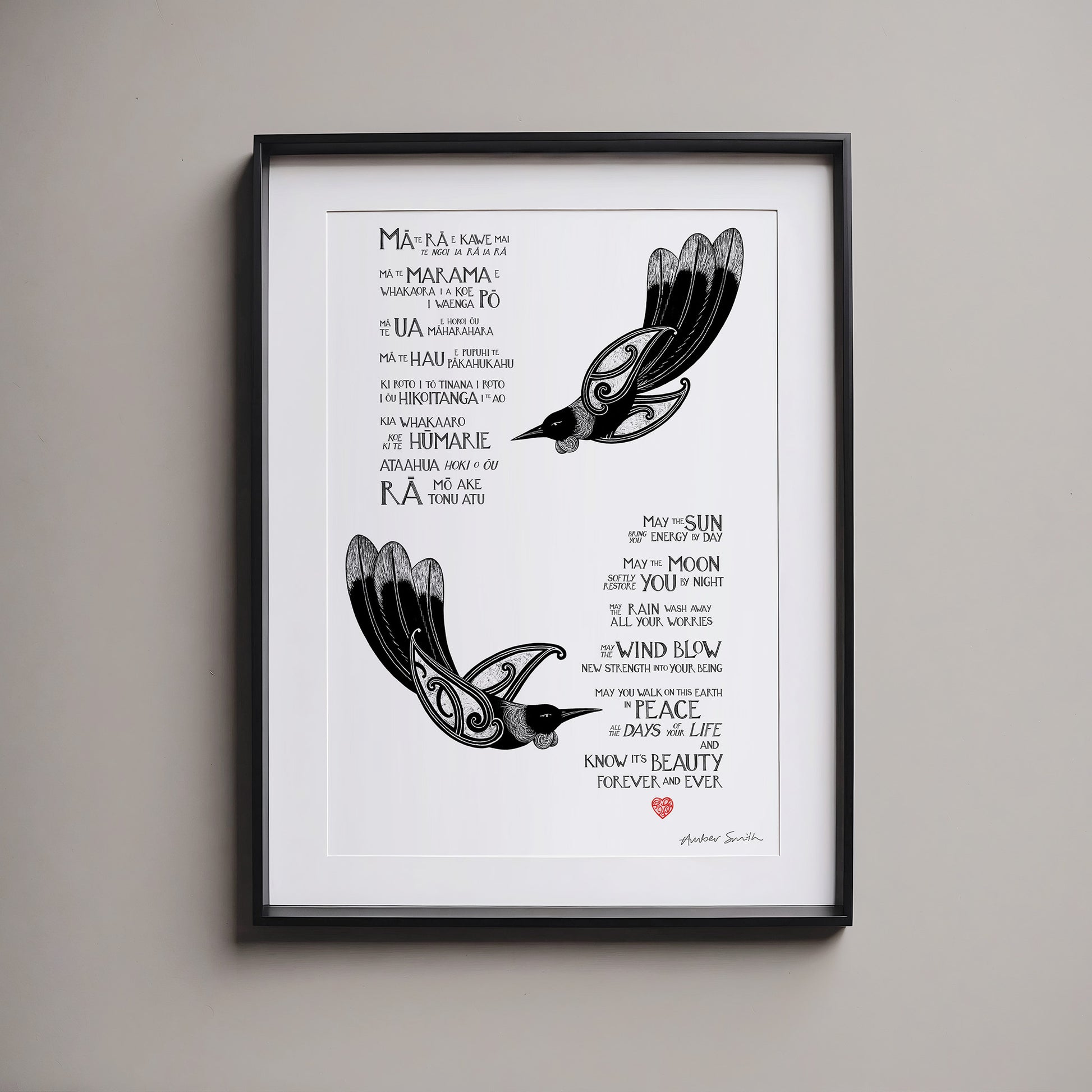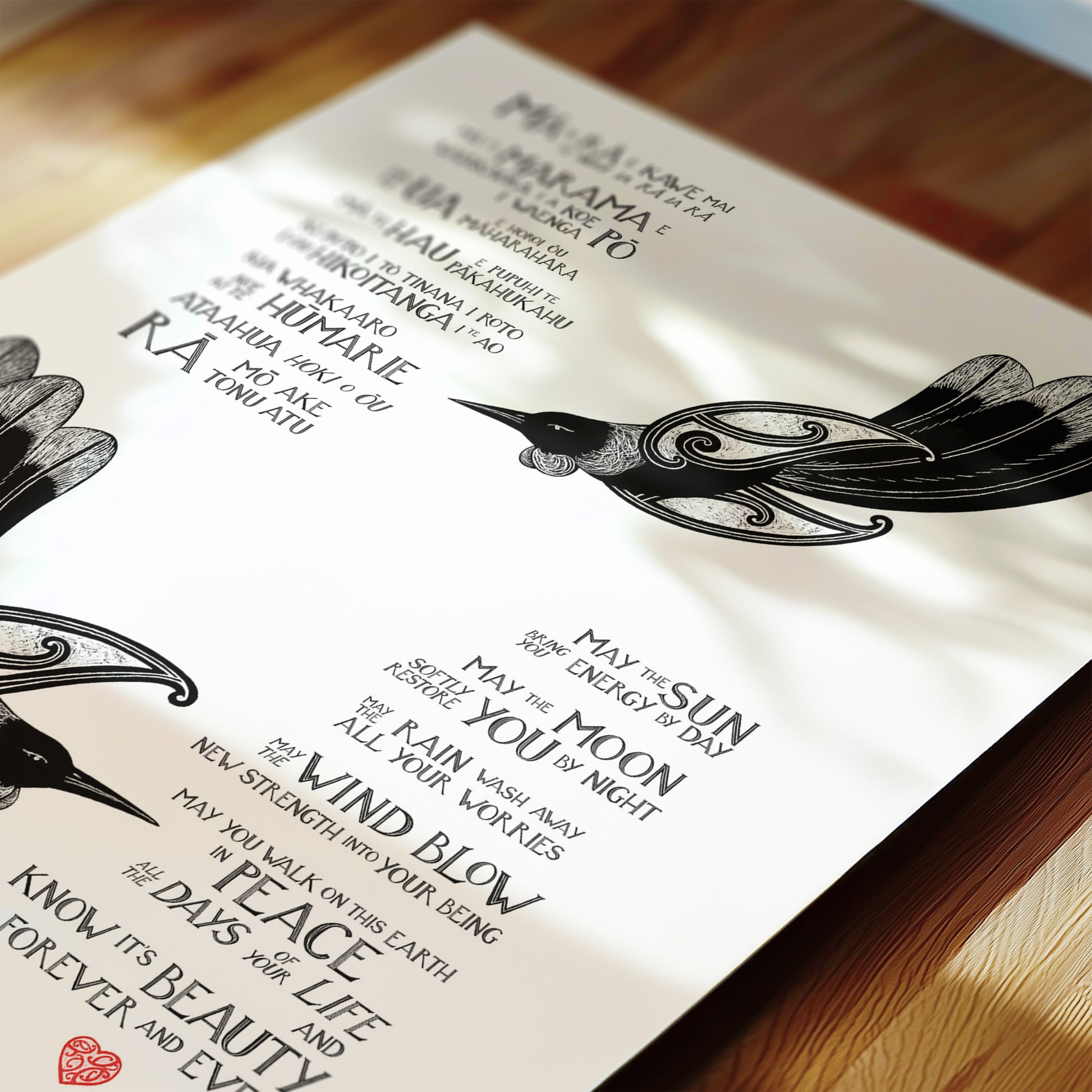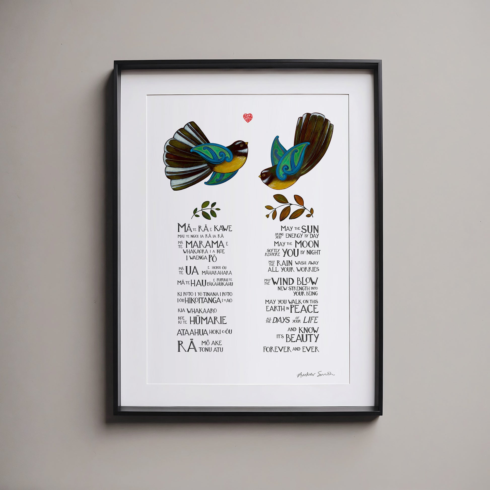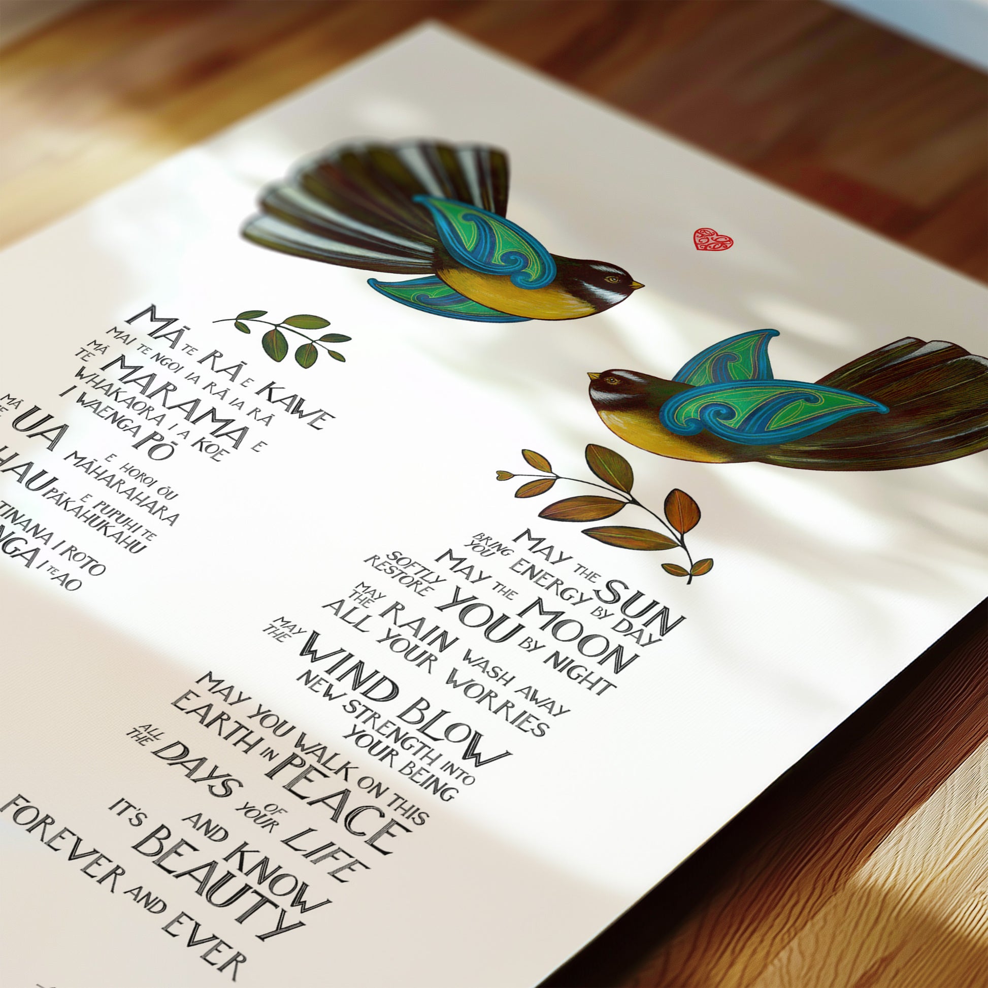 Tui or softly coloured pīwakawaka emphasise the beautiful words of this karakia — carrying a blessing for energy, restoration, peace, and strength. Tui or softly coloured pīwakawaka fly around this karakia, carrying a blessing of energy, renewal, peace, and strength. The words are calming and loving, making it a special piece for home, or for places of care and learning.
