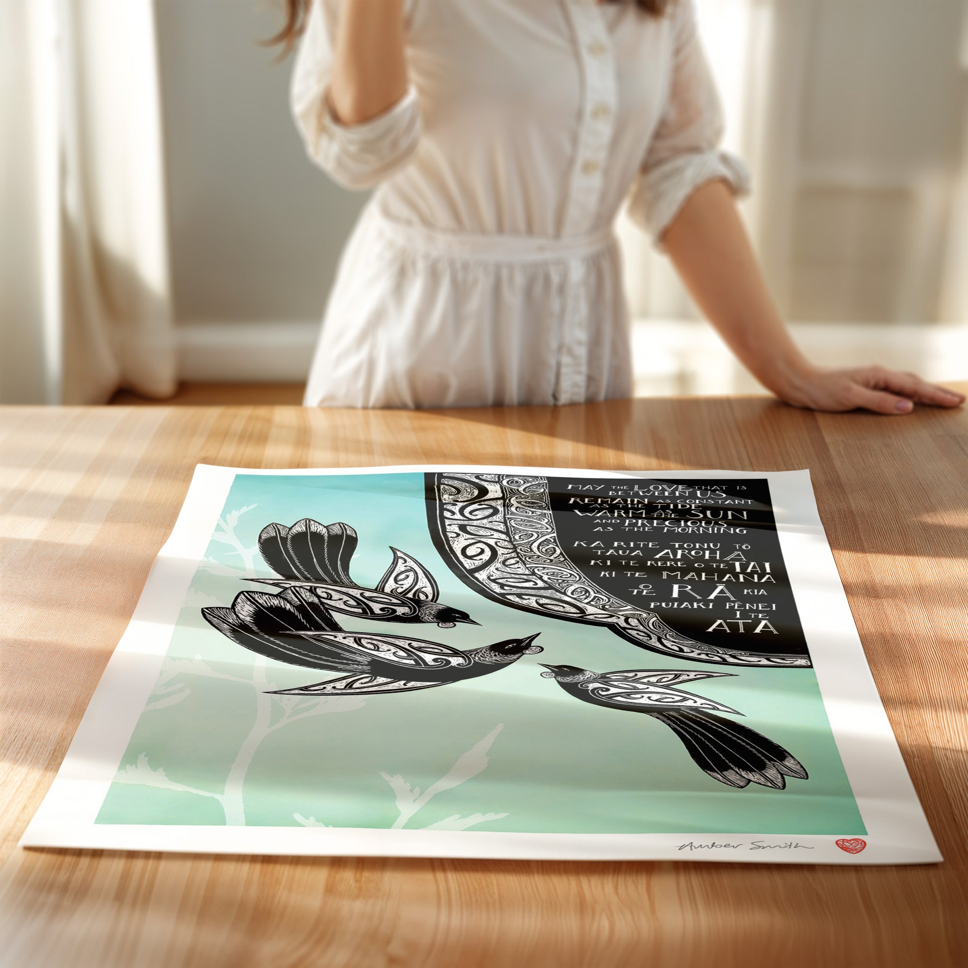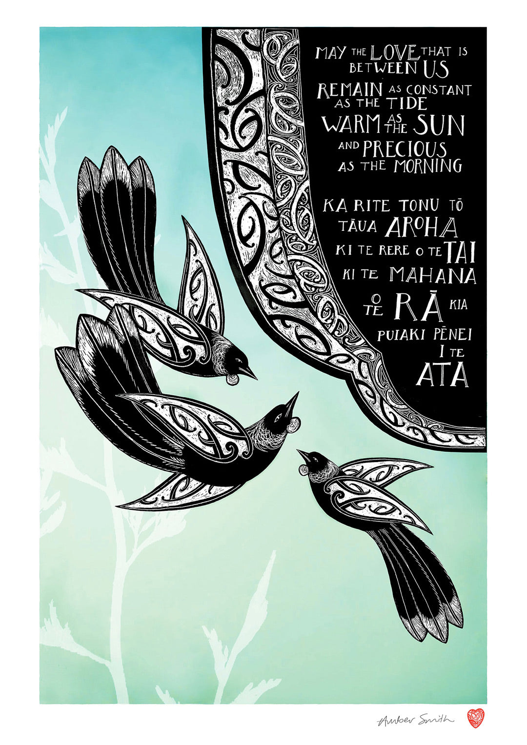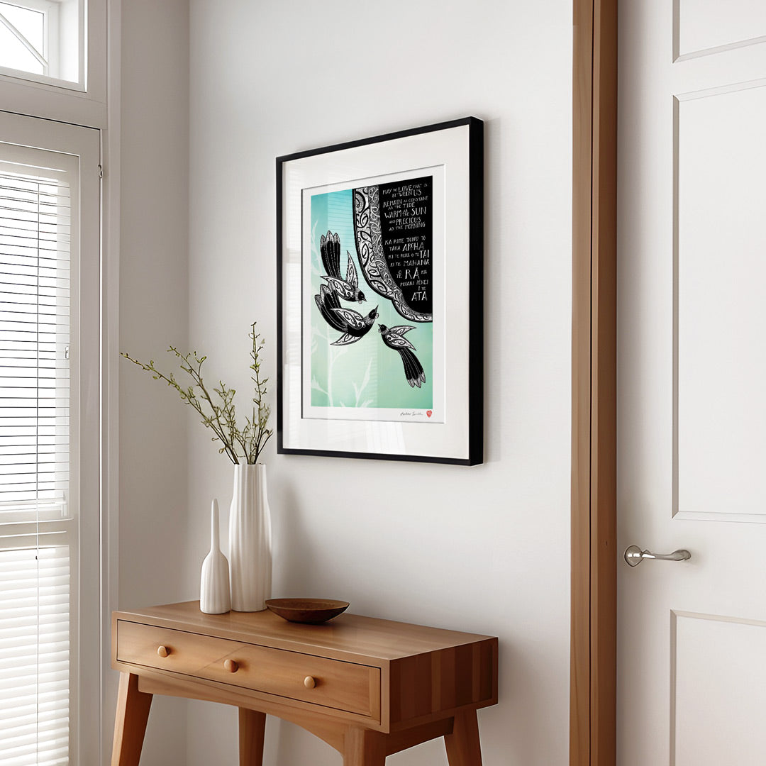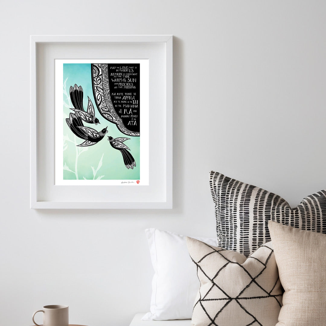 This print speaks of love in its warmth, its steadiness, and the promise of being there for one another. The flowing kōwhaiwhai design reflects connection, while the three tui represent hope, faith, and love.