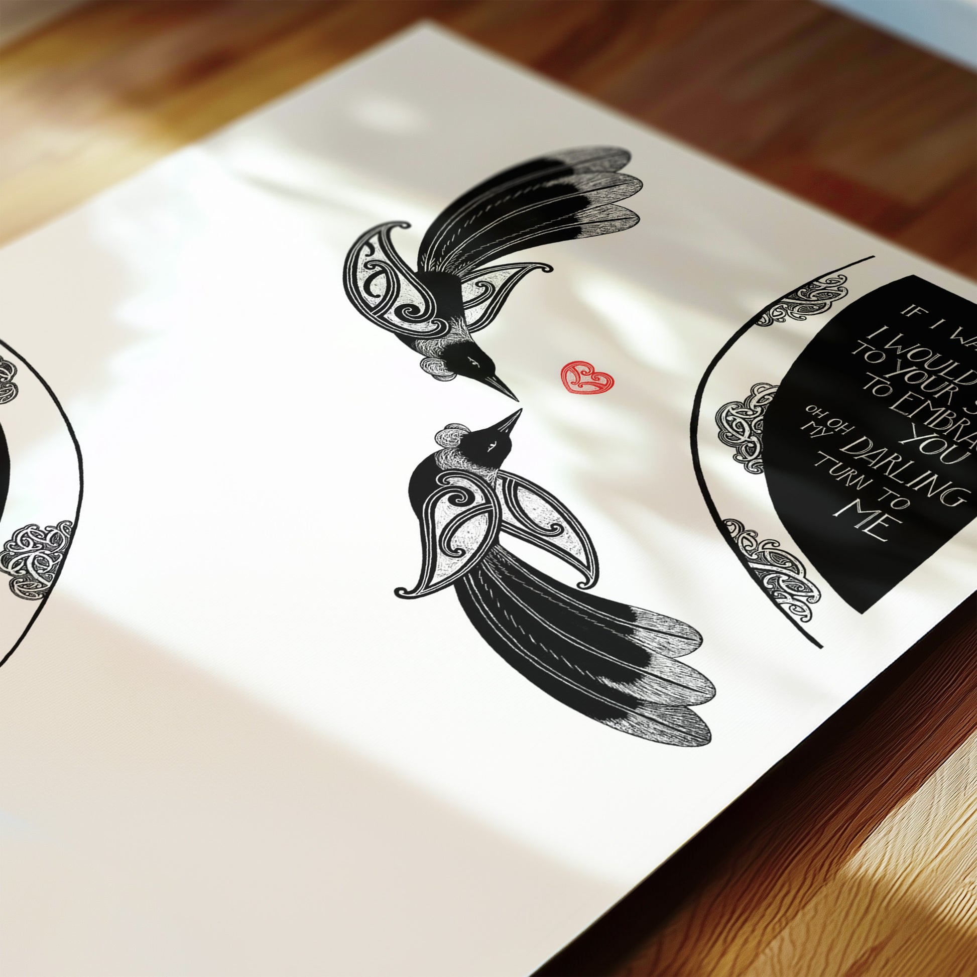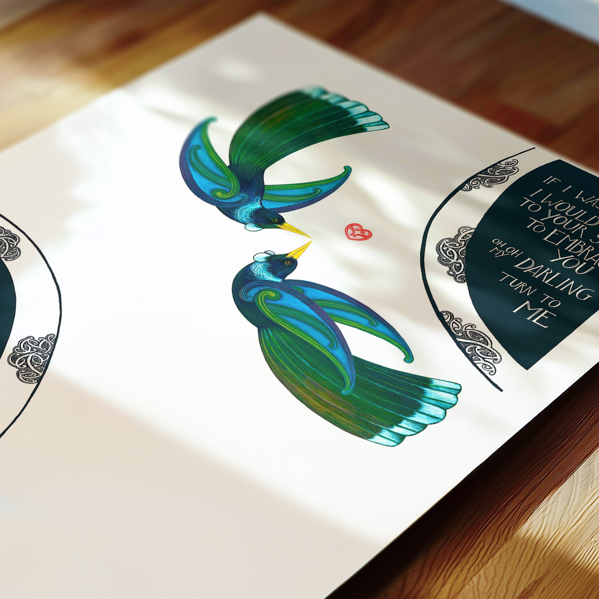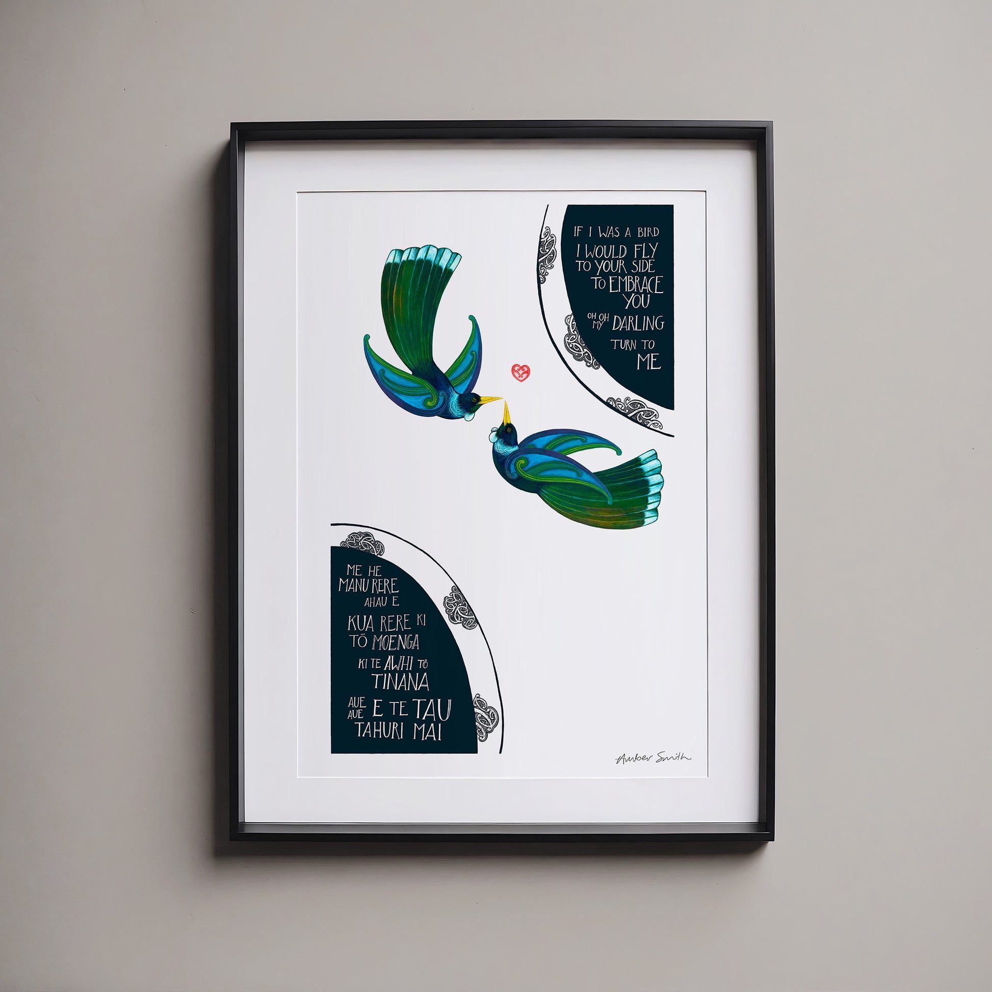 This waiata is all about the magnetic pull of love! The words are full of affection, heartfelt love, and a longing to be with that someone special. Its the hope and promise of togetherness, arohanui, a special connection that means you are together even when apart. The tui birds in this artwork symbolise lovers joyfully reunited.