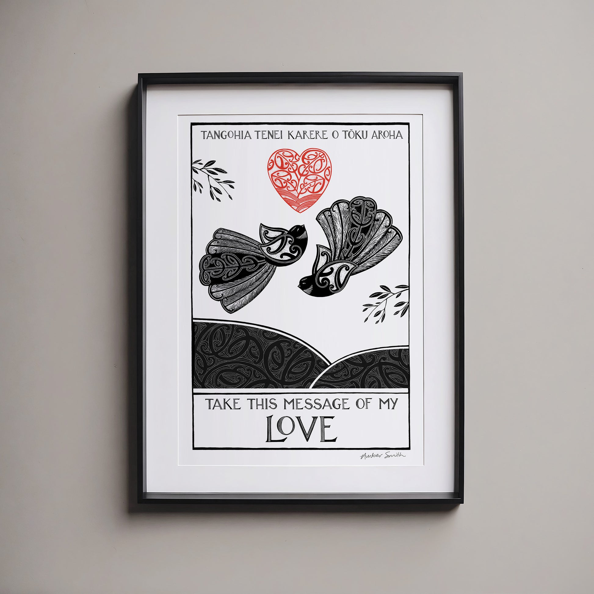 This print is a sweet and thoughtful gift for a partner, a long-distance loved one, or anyone you want to send a message of love and connection to. The red heart and playful fantails add warmth and joy, making it a lovely piece for a home, bedroom, or shared space.