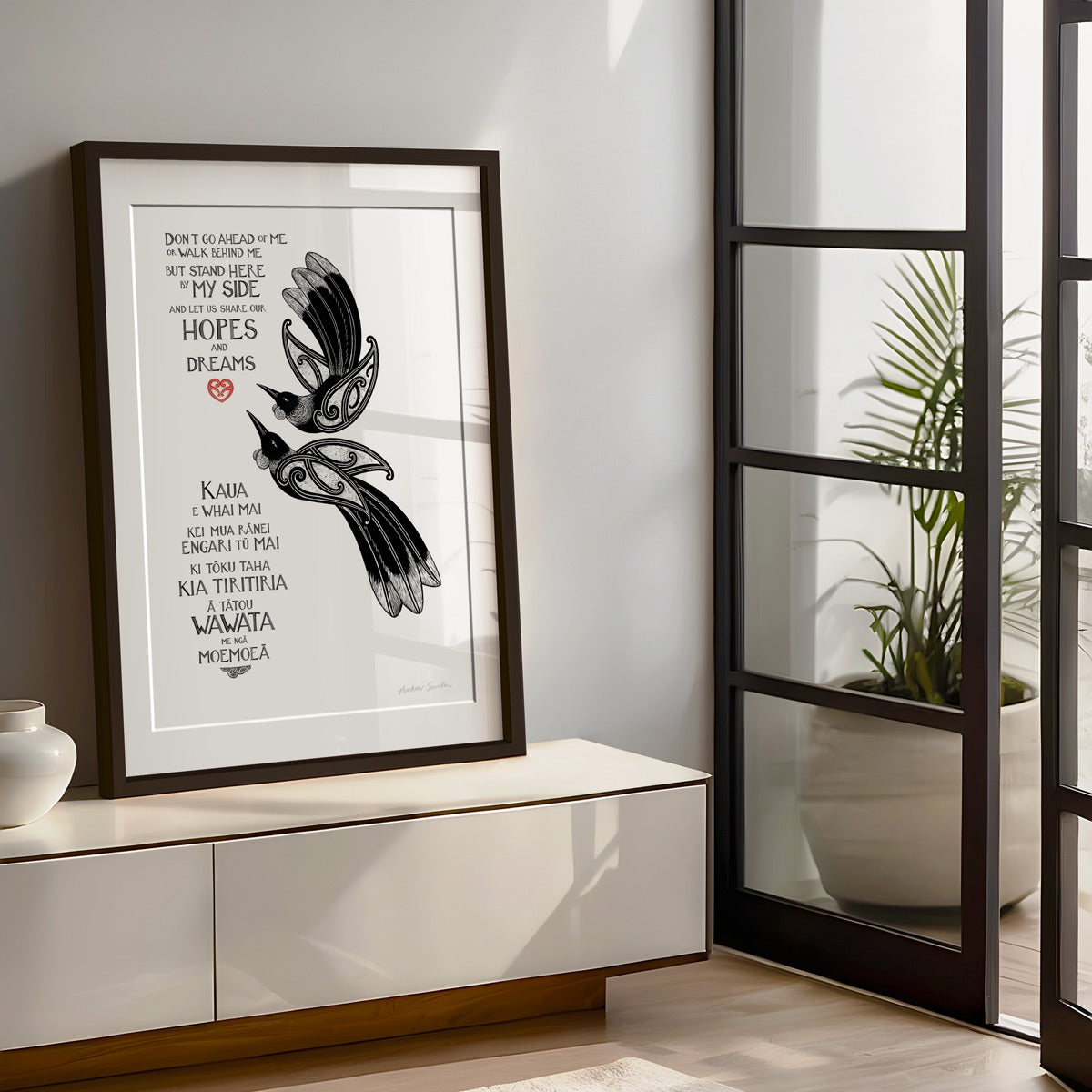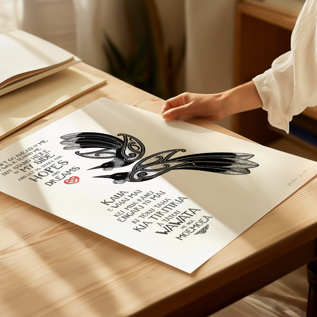 These two tui have flown in from different directions, different places, and now they’re side by side, flying together, with a shared vision of their lives ahead. It’s a print that speaks of a love that’s steady and sure. Aroha, loyalty, partnership - walking side by side, and choosing each other every day.