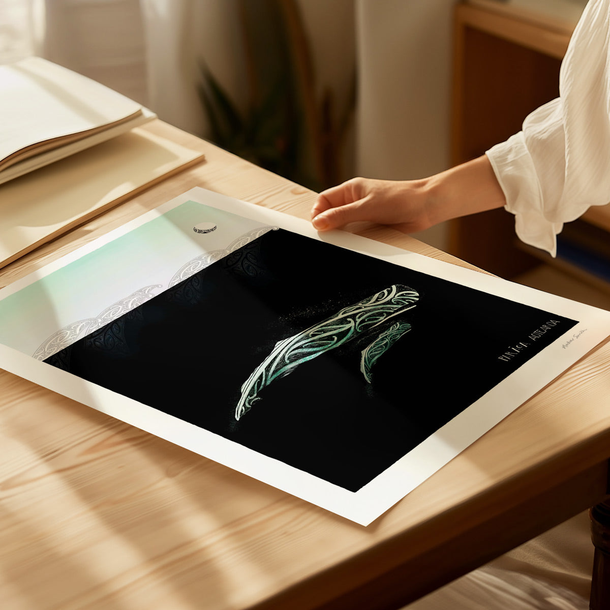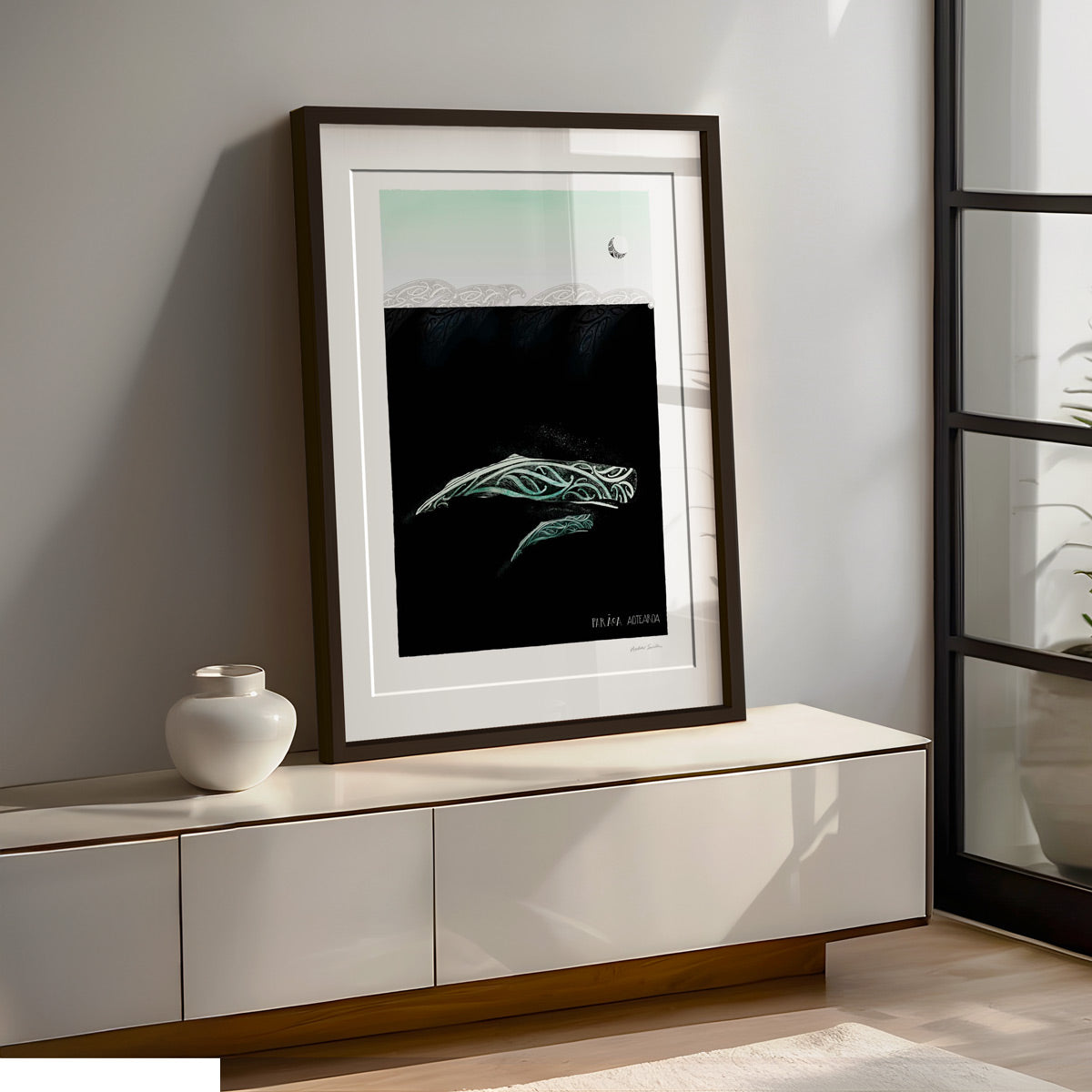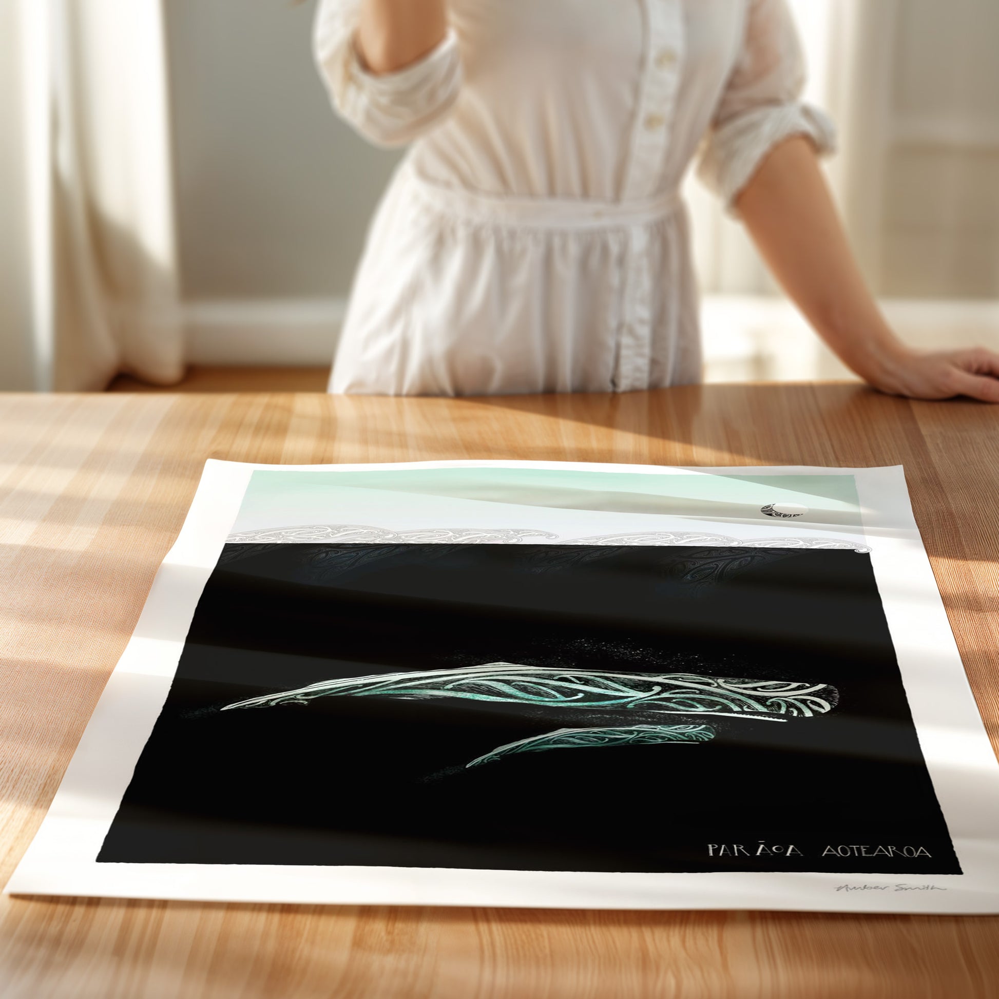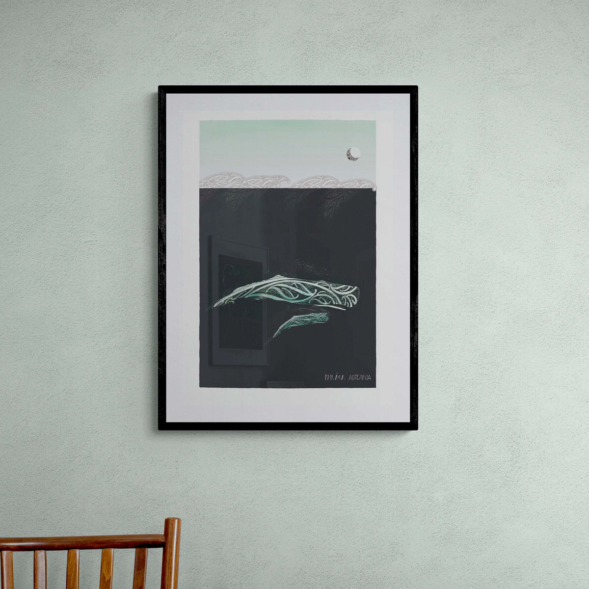The mother and calf journey beneath the night sky. Marama, the moon overhead is the natural world of life and light. The kowhaiwhai waves are new life intertwined with the lives of those before, the love between parent and child and the love and protection of whanau.