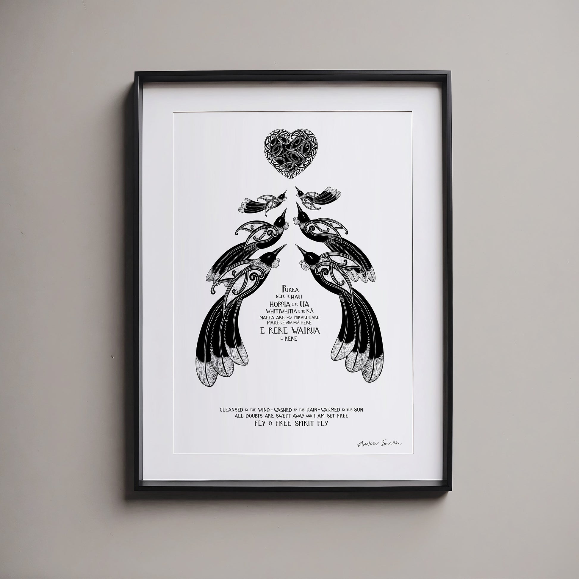 “Purea Nei” is a waiata / song - It speaks of the wairua (spirit) being lifted and carried toward the light, with troubles and restrictions falling away. The imagery of wind, rain, and sun reflects the healing power of the natural world, while the refrain “Makere ana ngā here” reminds us to let go of what holds us back. This print is a meaningful choice for a space of reflection, for honouring someone’s memory, or as a gift to offer encouragement and a sense of renewal.