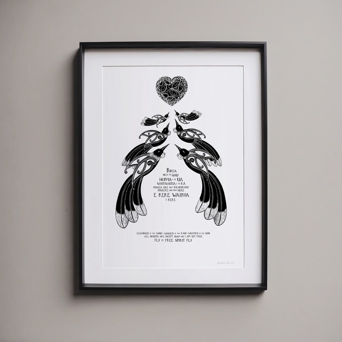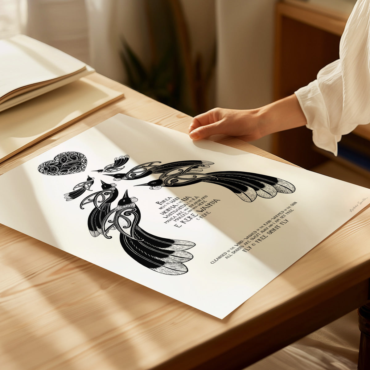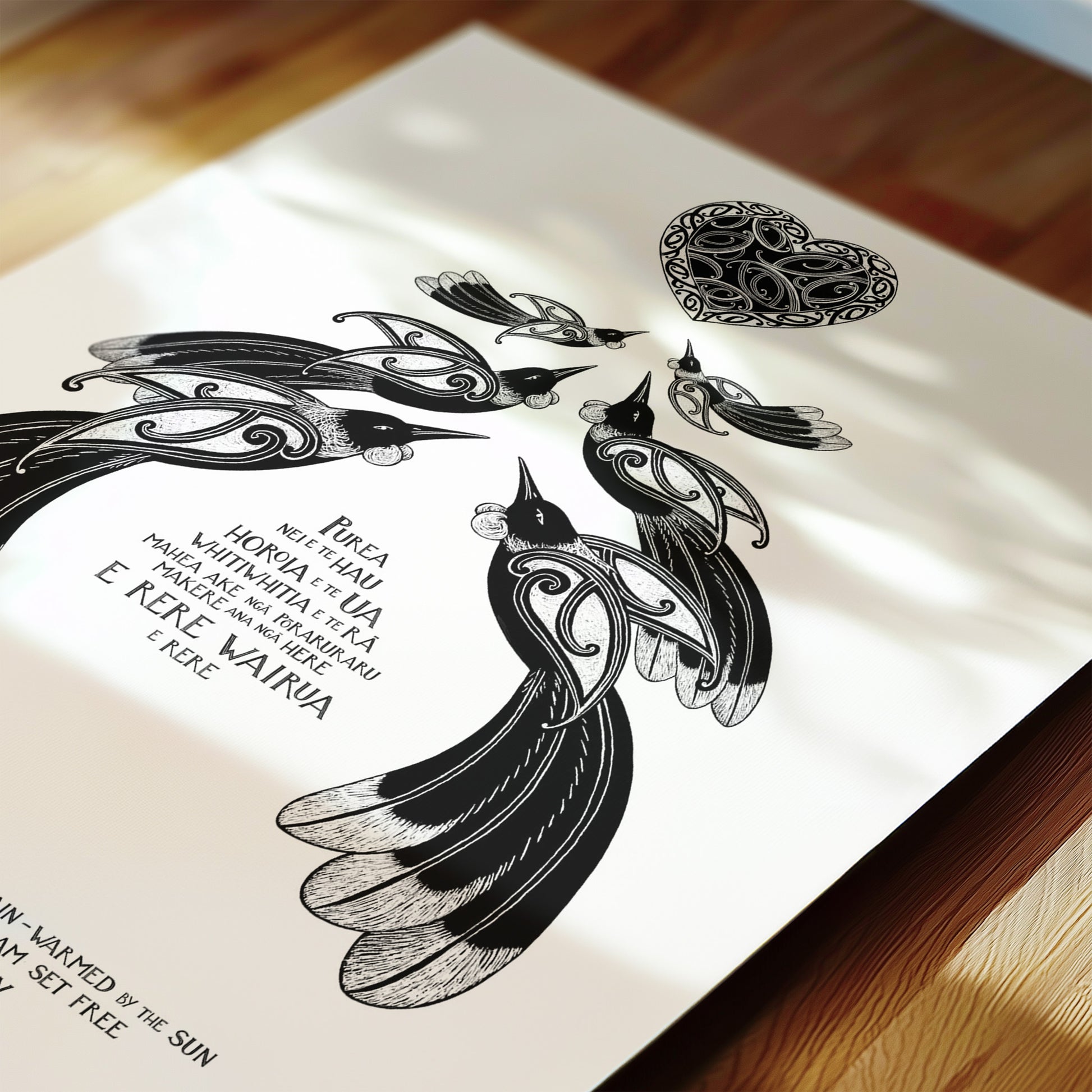 “Purea Nei” is a waiata / song - It speaks of the wairua (spirit) being lifted and carried toward the light, with troubles and restrictions falling away. The imagery of wind, rain, and sun reflects the healing power of the natural world, while the refrain “Makere ana ngā here” reminds us to let go of what holds us back. This print is for a space of reflection, for honouring someone’s memory, or as a gift to offer encouragement and a sense of renewal.