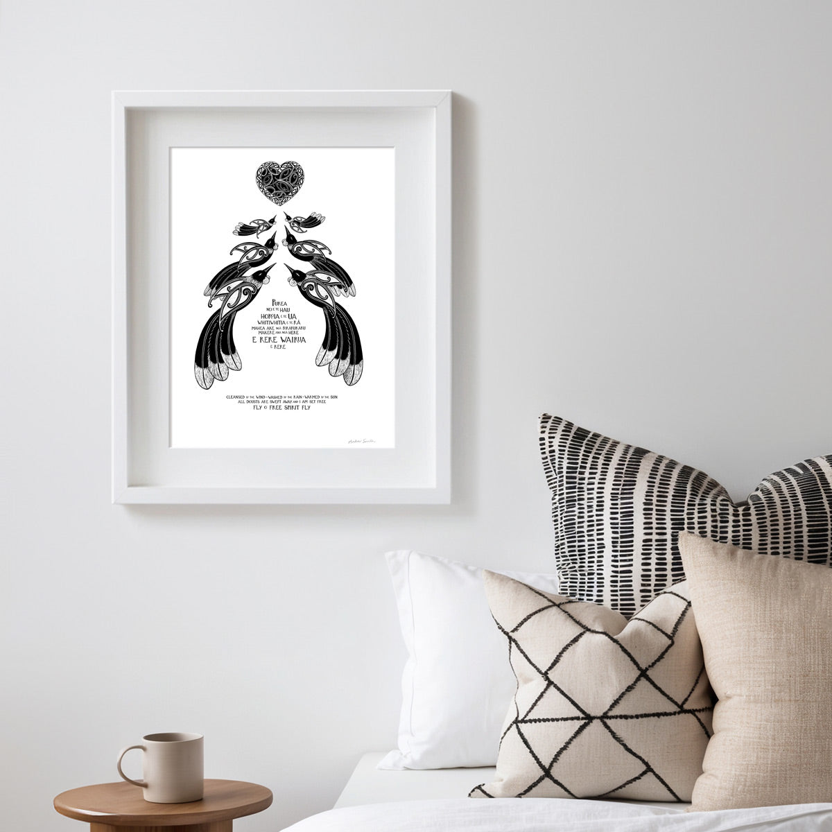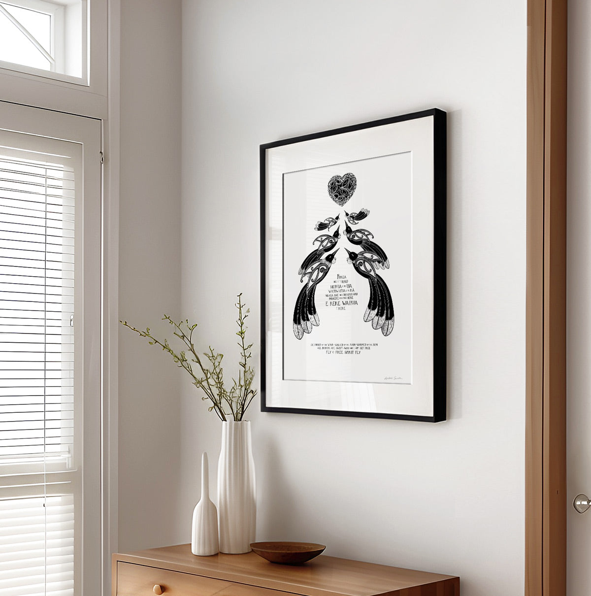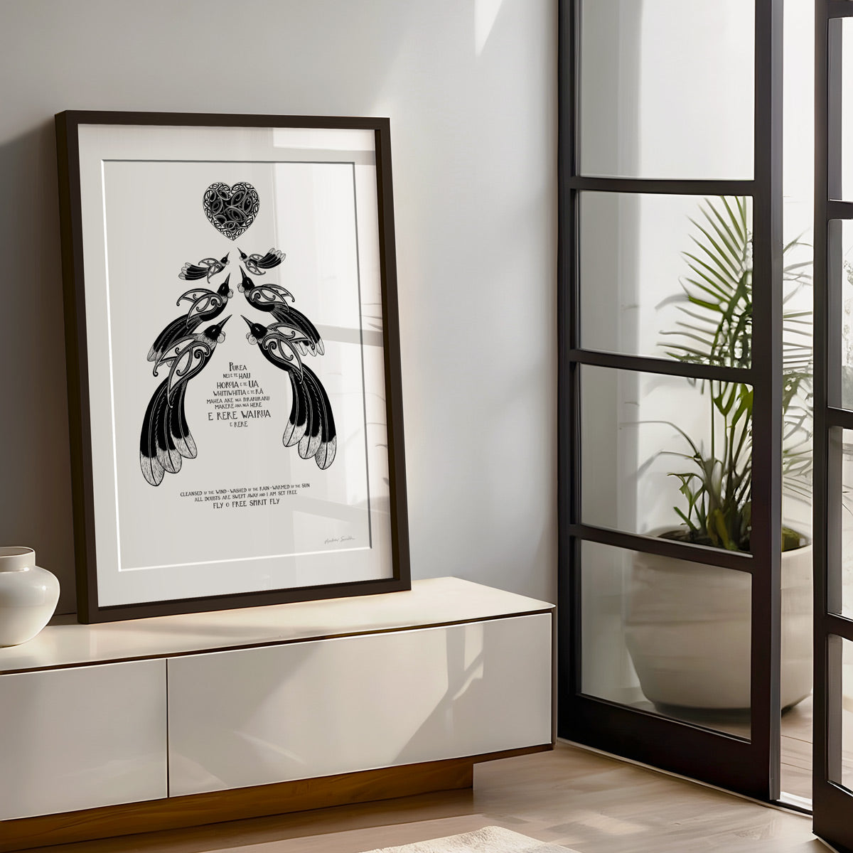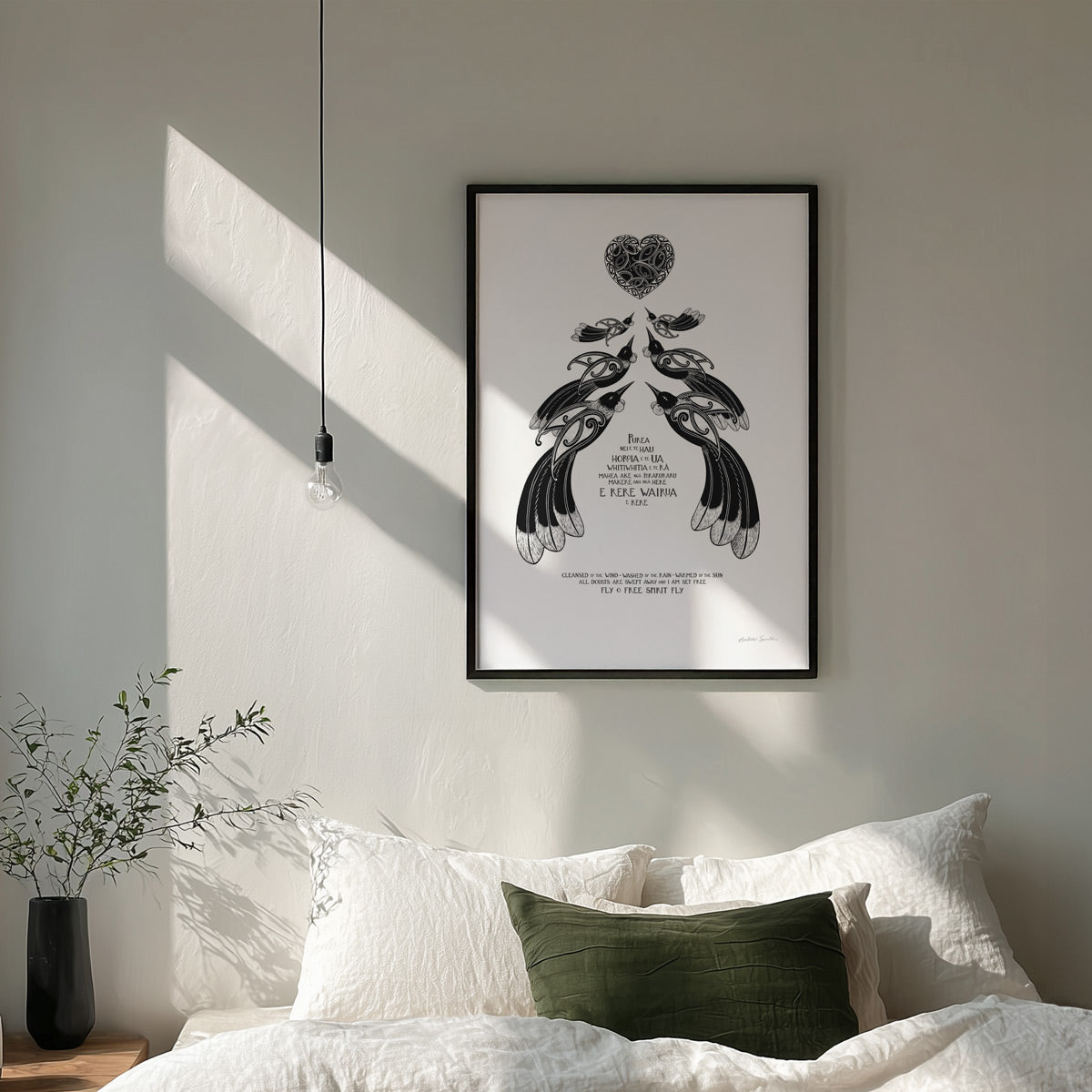 “Purea Nei” is a waiata / song - It speaks of the wairua (spirit) being lifted and carried toward the light, with troubles and restrictions falling away. The imagery of wind, rain, and sun reflects the healing power of the natural world, while the refrain “Makere ana ngā here” reminds us to let go of what holds us back. This print is for a space of reflection, for honouring someone’s memory, or as a gift to offer encouragement and a sense of renewal.