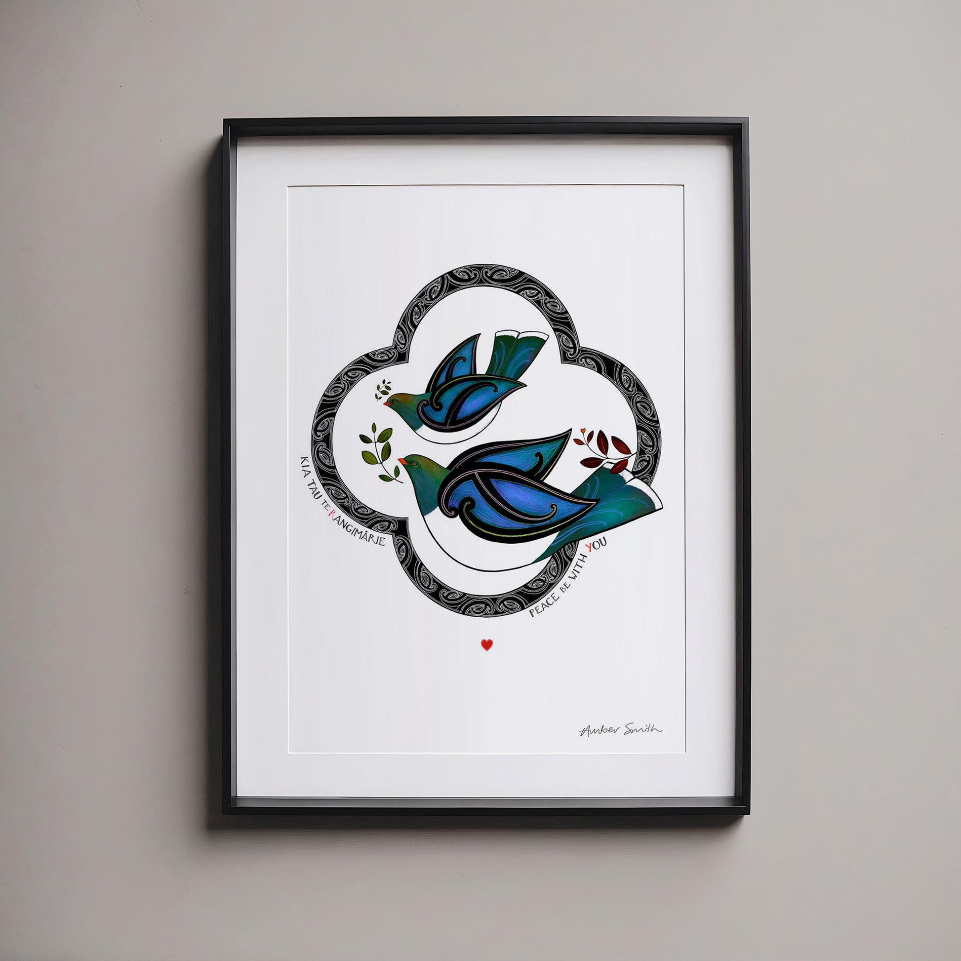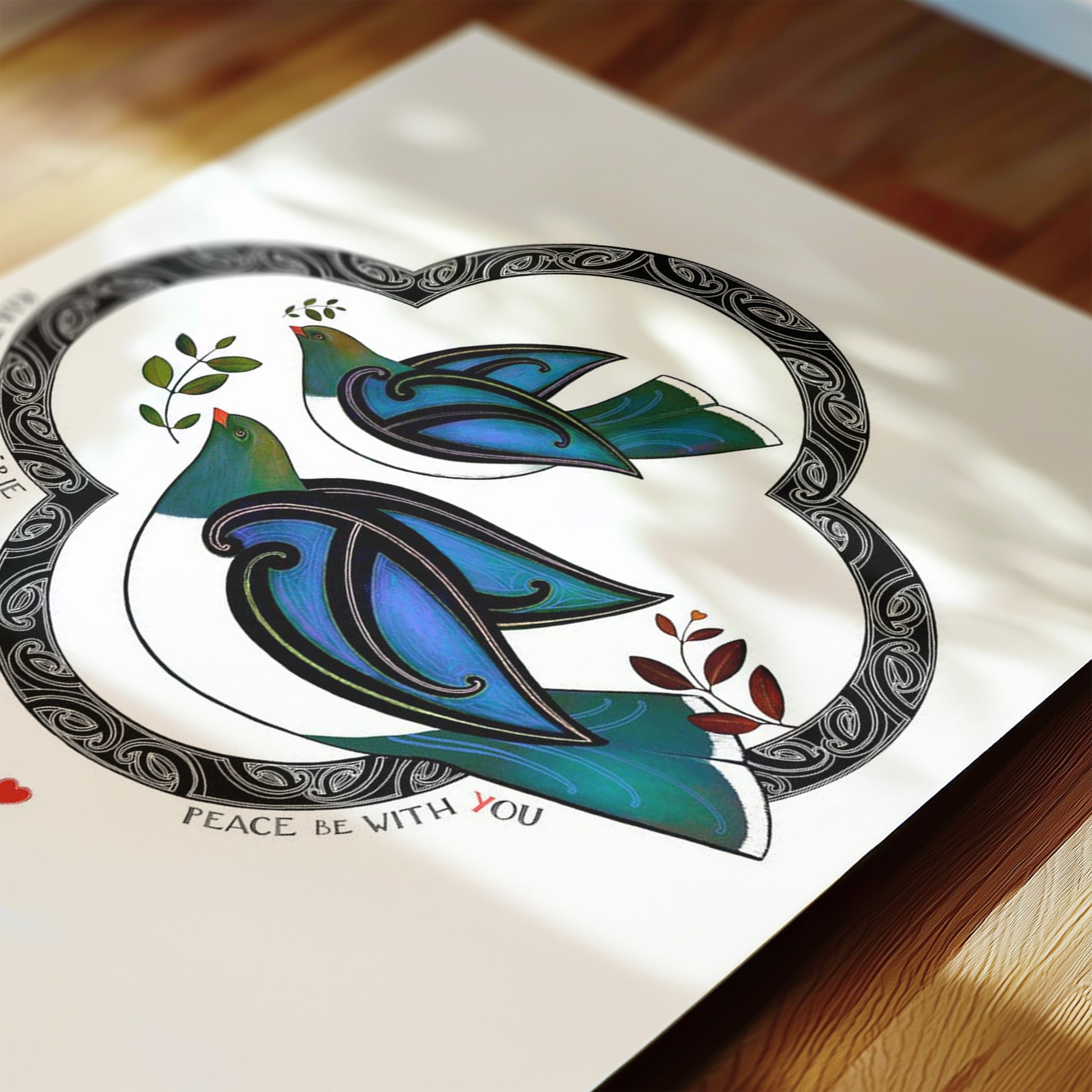 Two beautifully coloured kererū fly side by side, carrying with them a blessing of peace — Kia tau te rangimārie. This print offers a sense of calm and stillness, something we all appreciate in our lives. It’s ideal for welcoming guests (manuhiri) into your home, gifting to loved ones beginning a new journey, or sharing a quiet wish of peace with someone dear.