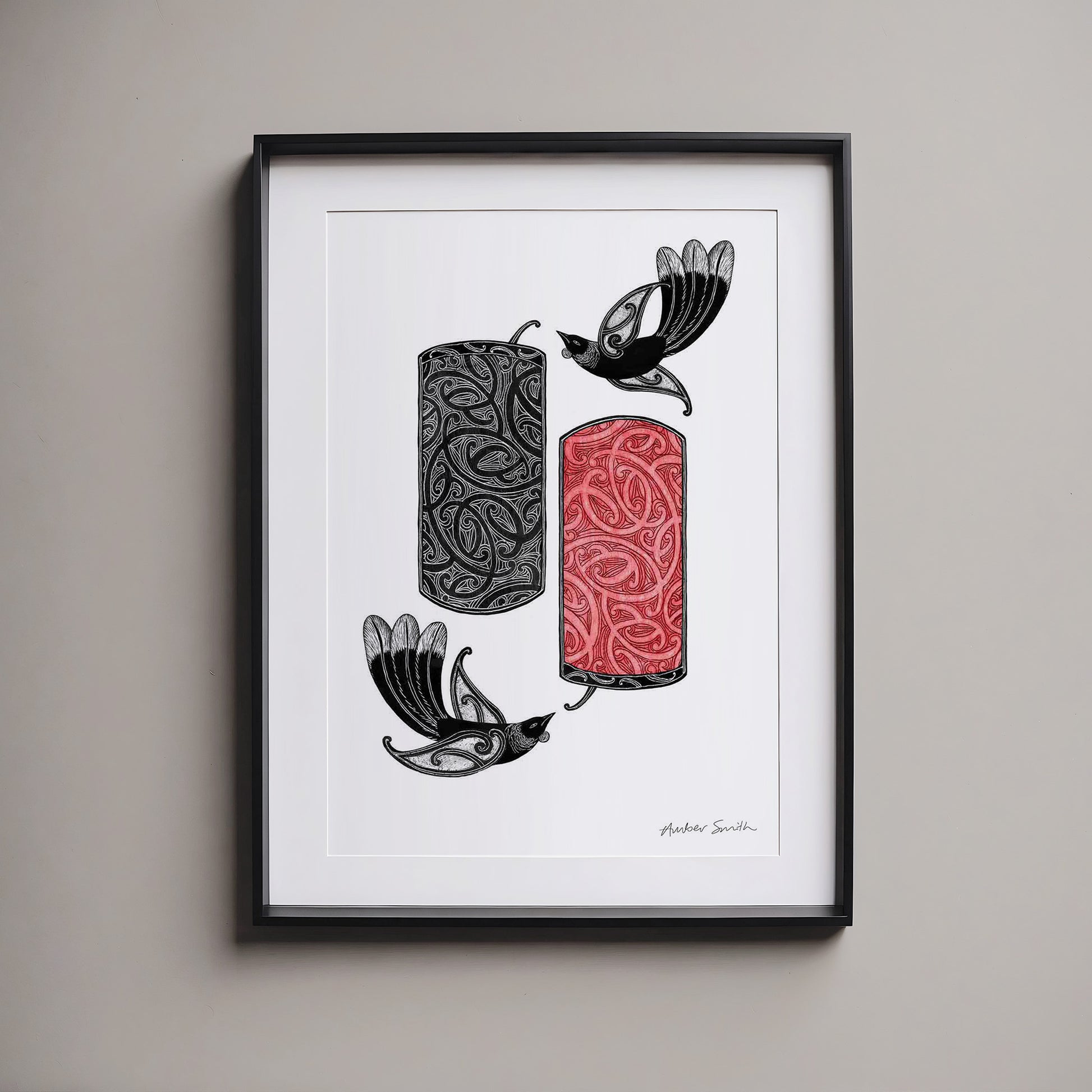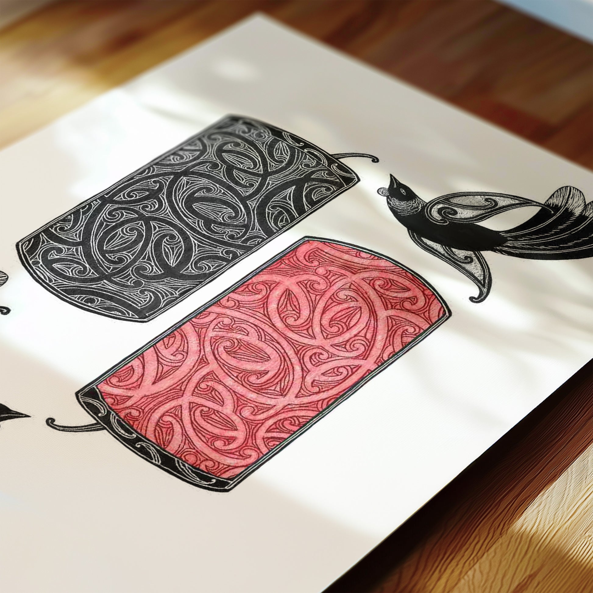 Korero means to speak or tell, and kowhaiwhai is a Māori way of telling a story with patterns. This print is about that connection — to the birds, to nature, and to each other.