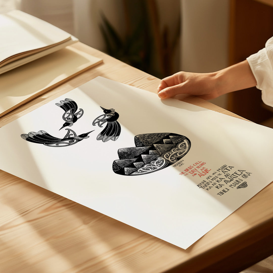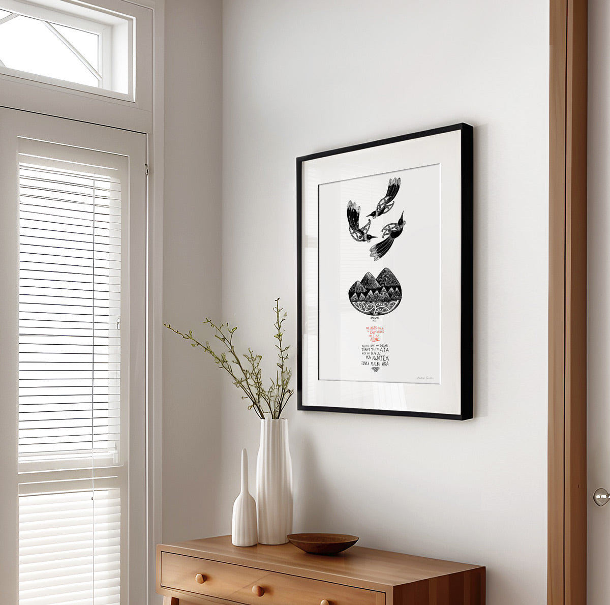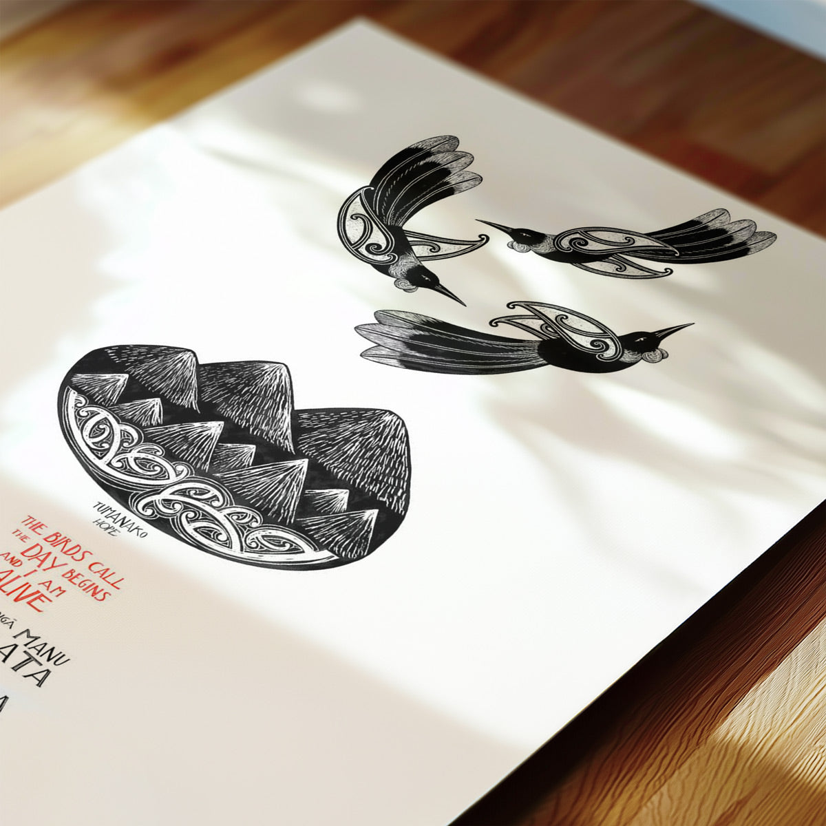 In this print, three tui soar above mountains and sea, they welcome the new day, filled with energy and renewal. The tui sing, dawn breaks, and life is affirmed - tīhei mauri ora - the breath of life - Each day is a fresh start. The mountains also references the whakataukī: