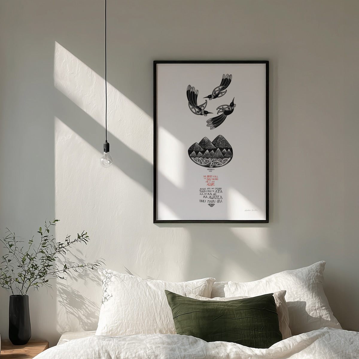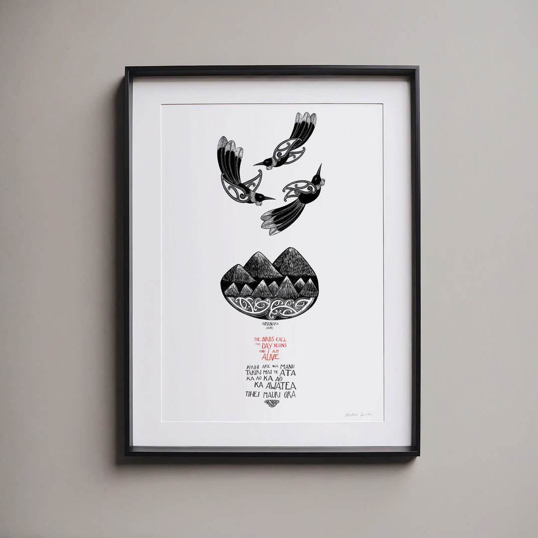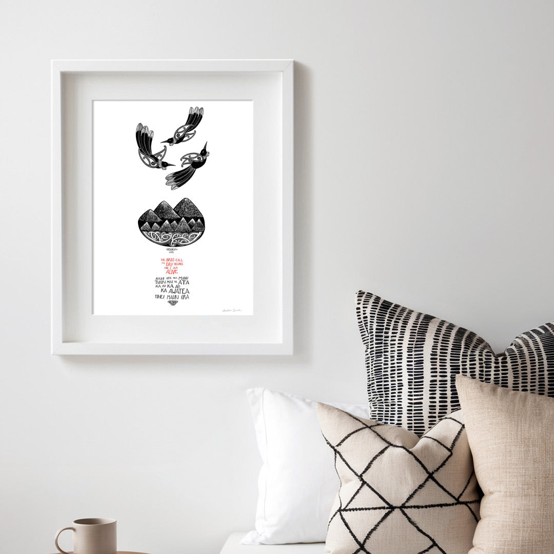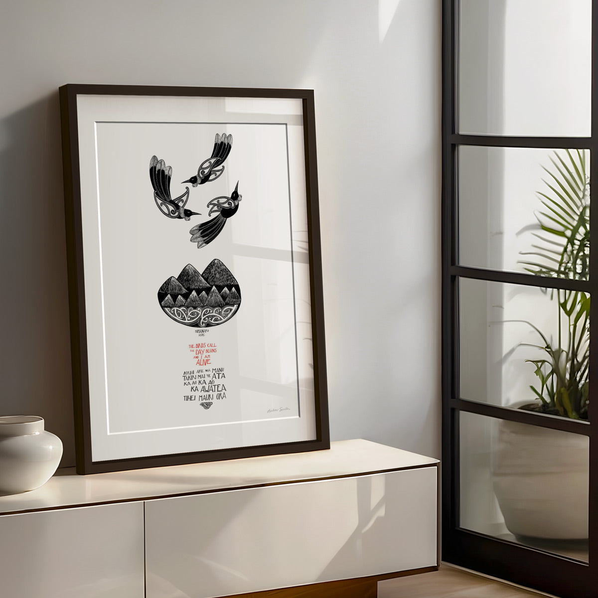 In this print, three tui soar above mountains and sea, they welcome the new day, filled with energy and renewal. The tui sing, dawn breaks, and life is affirmed - tīhei mauri ora - the breath of life - Each day is a fresh start. The mountains also references the whakataukī: