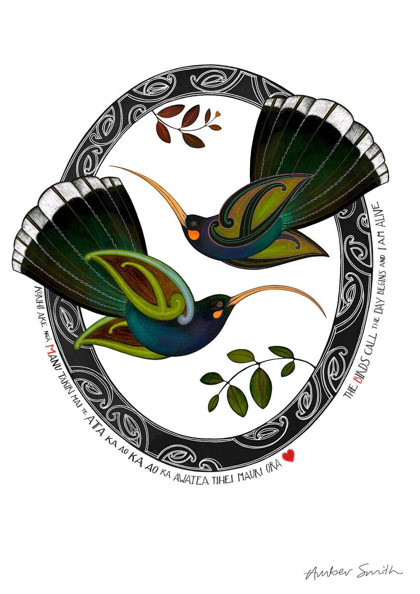 Tūmanako means hope - The dawn chorus reminds us that each day is a fresh beginning, a chance to start again. This print carries the message that every sunrise brings new light, new beginnings, and fresh possibility. It features two huia - precious birds of Aotearoa - flying together as guardians of hope.