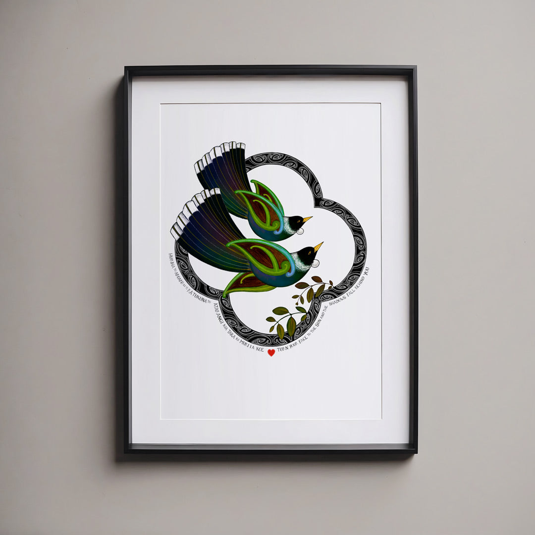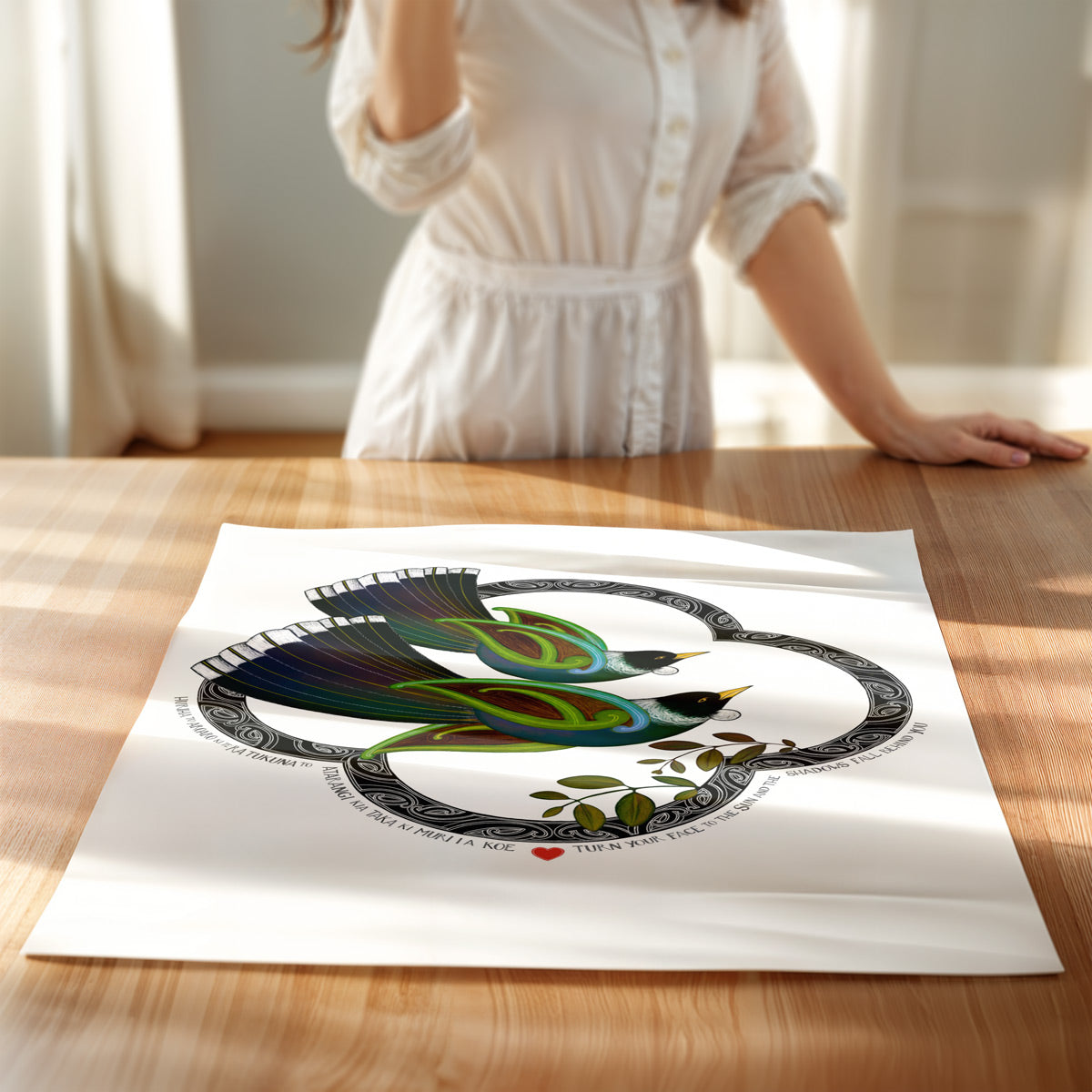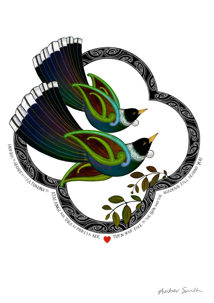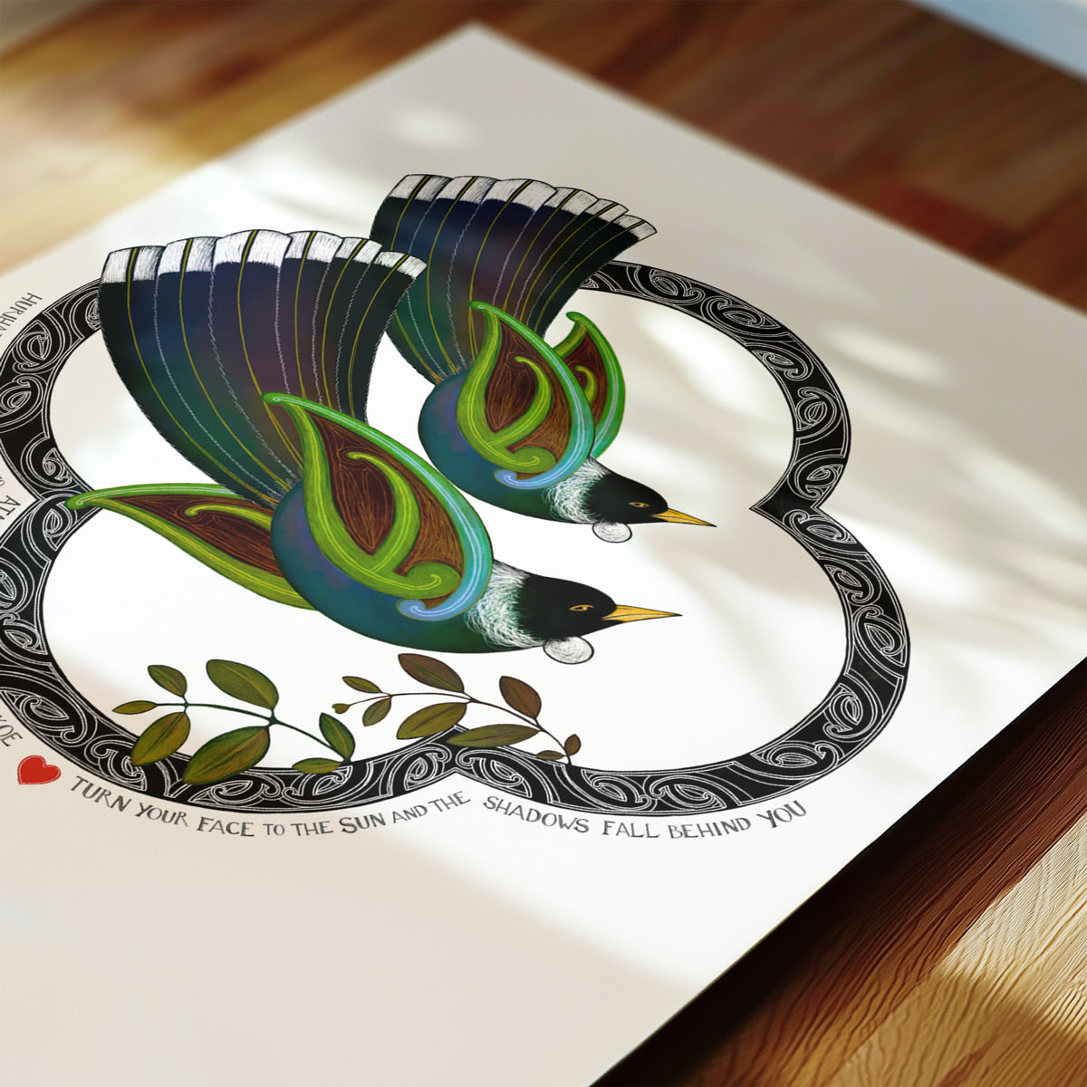 Whakapono means faith. It’s about trusting that things will work out, believing in your future, and having confidence in what is to come. The tui lift their faces toward the sun, symbols of joy, confidence, and resilience — messengers of encouragement and self-belief.