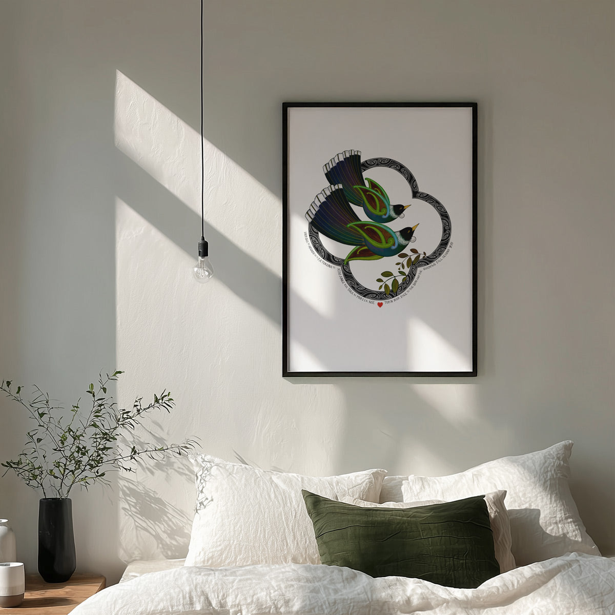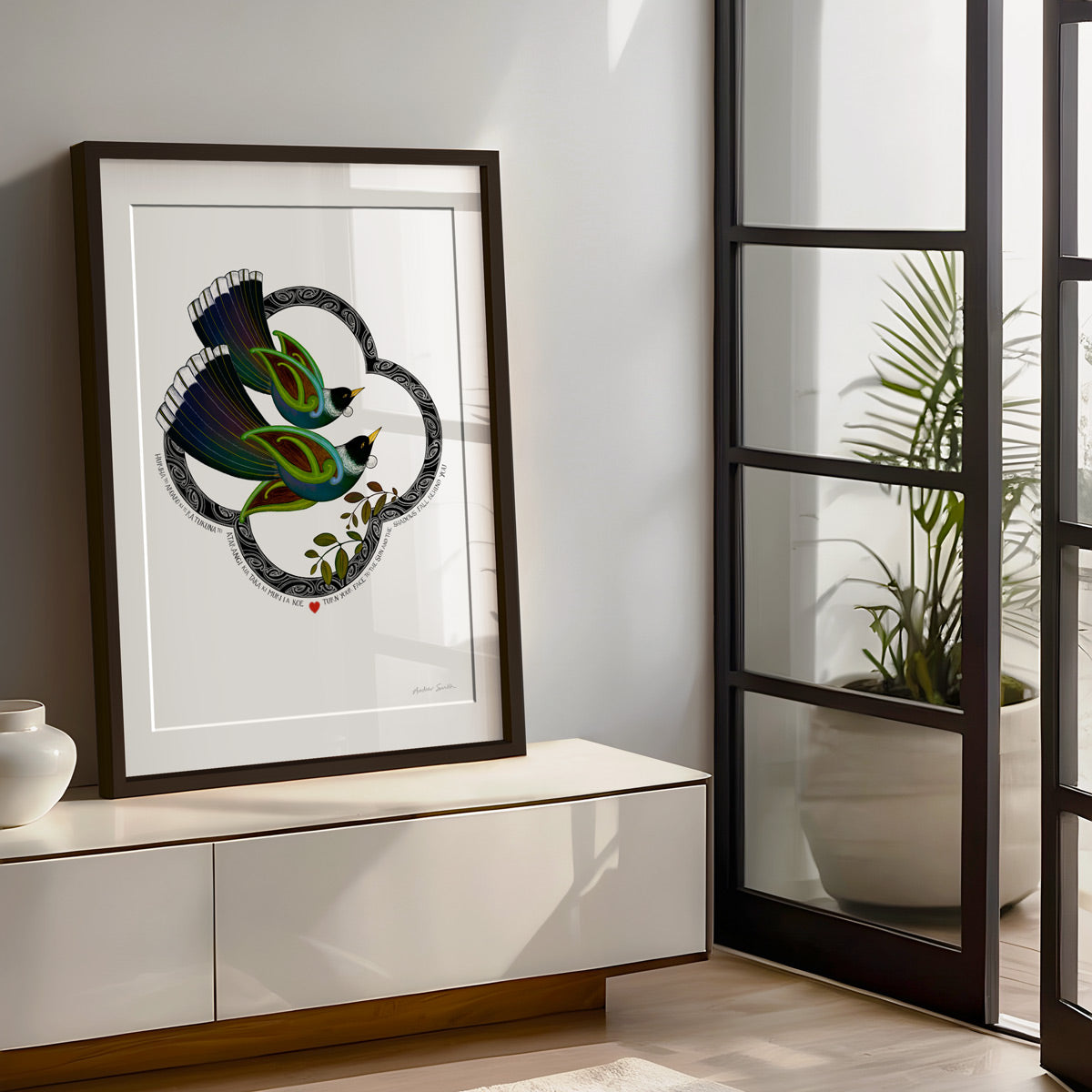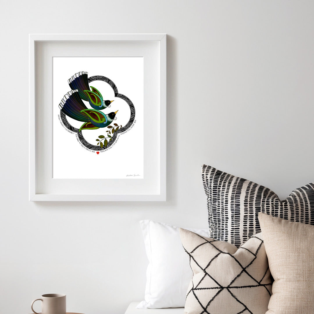 Whakapono means faith. It’s about trusting that things will work out, believing in your future, and having confidence in what is to come. The tui lift their faces toward the sun, symbols of joy, confidence, and resilience — messengers of encouragement and self-belief.