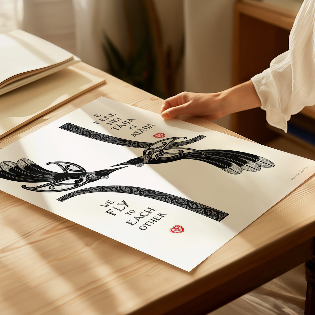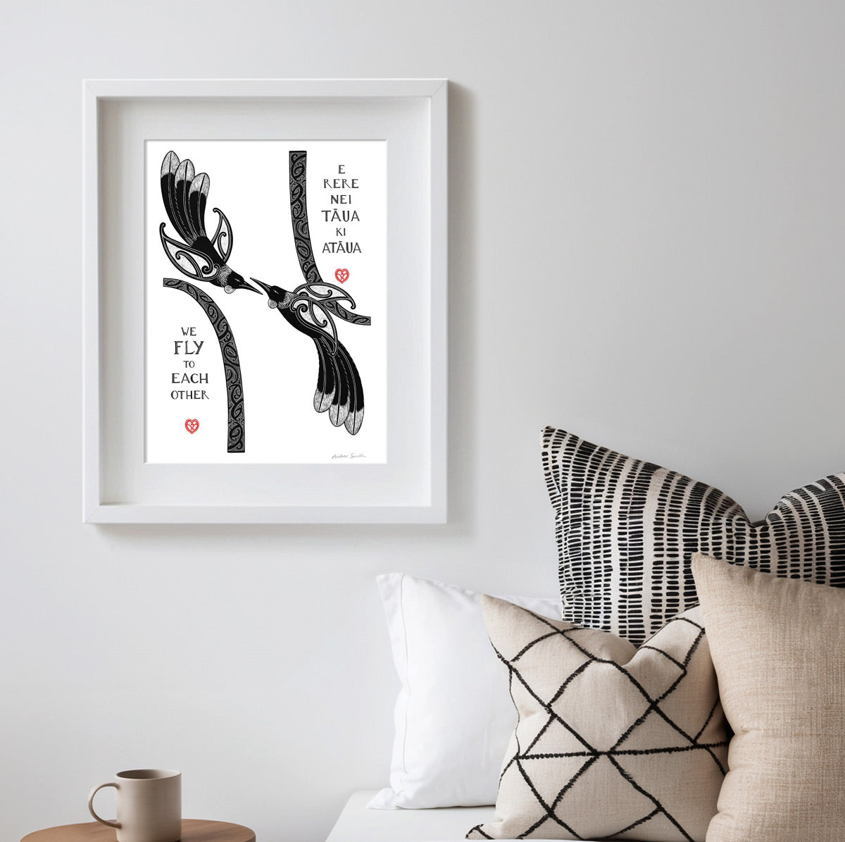 Two tui fly toward one another, drawn together across the distance. This print is about that feeling of finding your person - the one you’re meant to be with - or the joy of being reunited after time apart. An imageof love that always finds it's way ❤️
