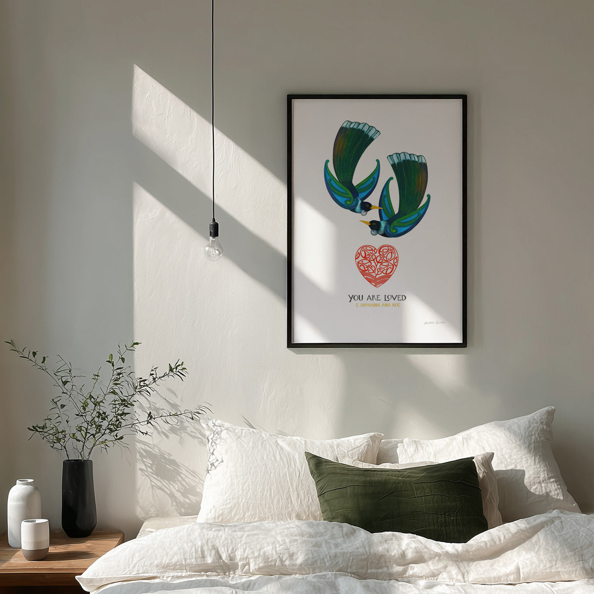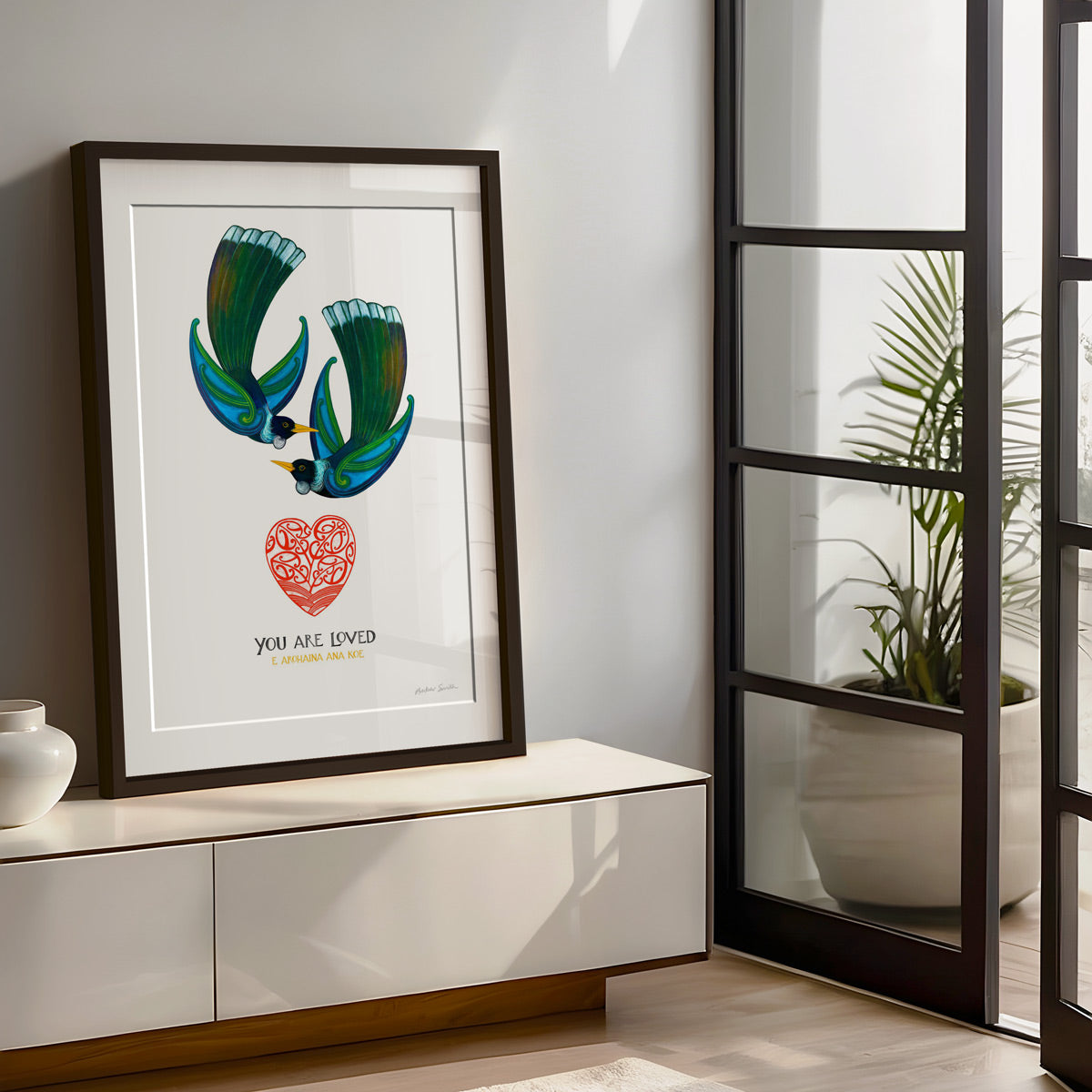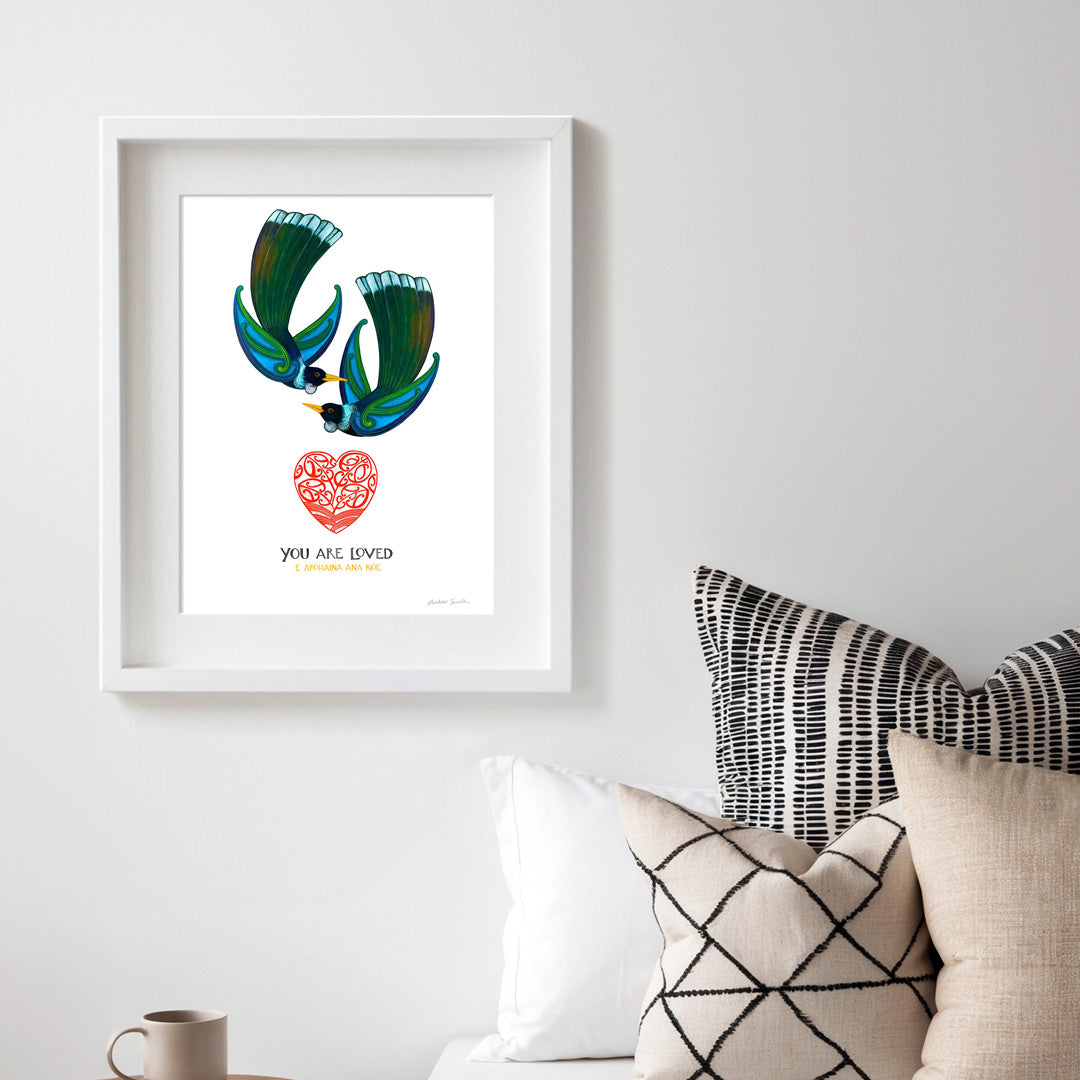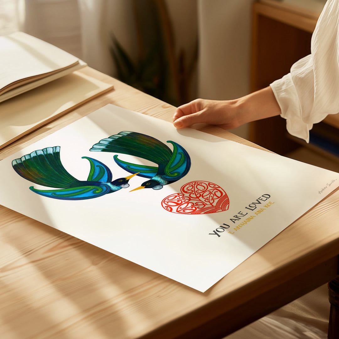 Two tui fly above a red kowhaiwhai heart, with the message ~ You are loved, you are valued, and you belong. Playful, strong, and full of song, the tūi bring joy and connection - it's a reminder of love and for anyone who you wish to surround with aroha.